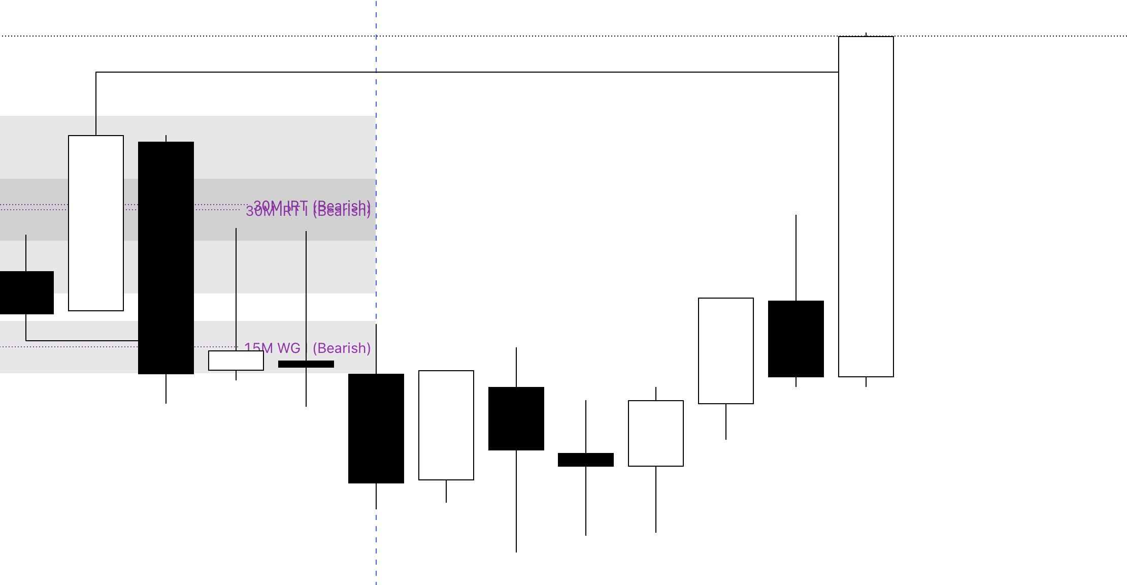 Confluences: 30M IRT bearish FVG and 15M IRT bearish FVG at the same level above a 30M WDT & IRT bearish FVG.