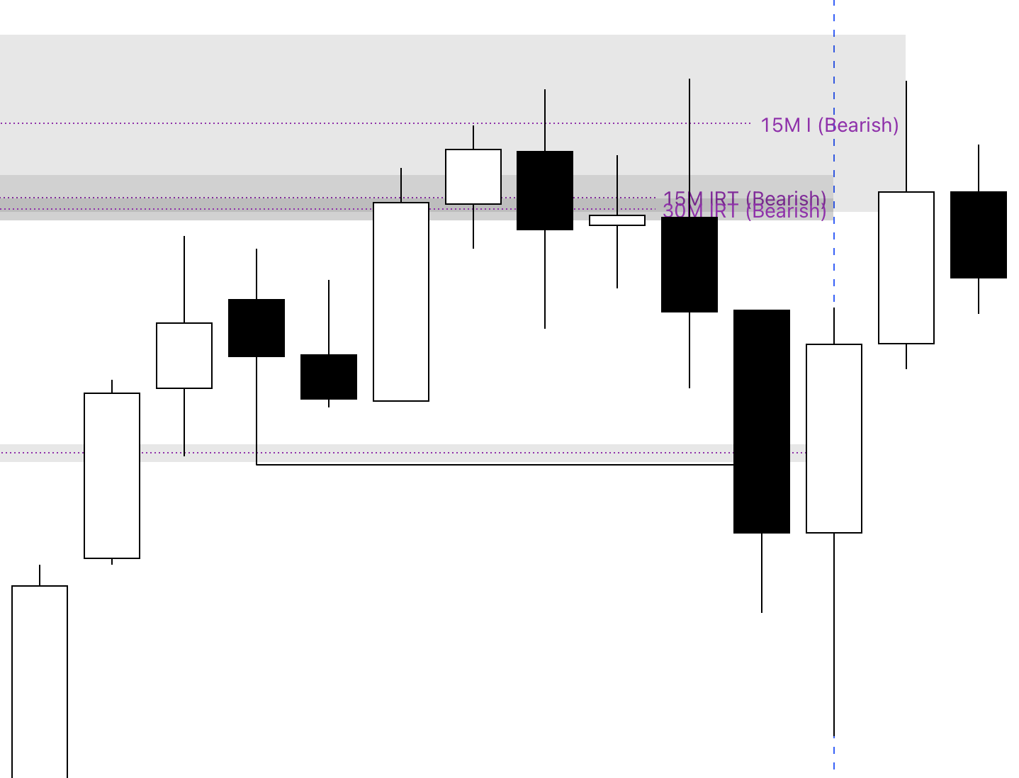 Confluences: 30M IRT bearish FVG and 15M IRT bearish FVG at the same level above a 30M WDT & IRT bearish FVG.