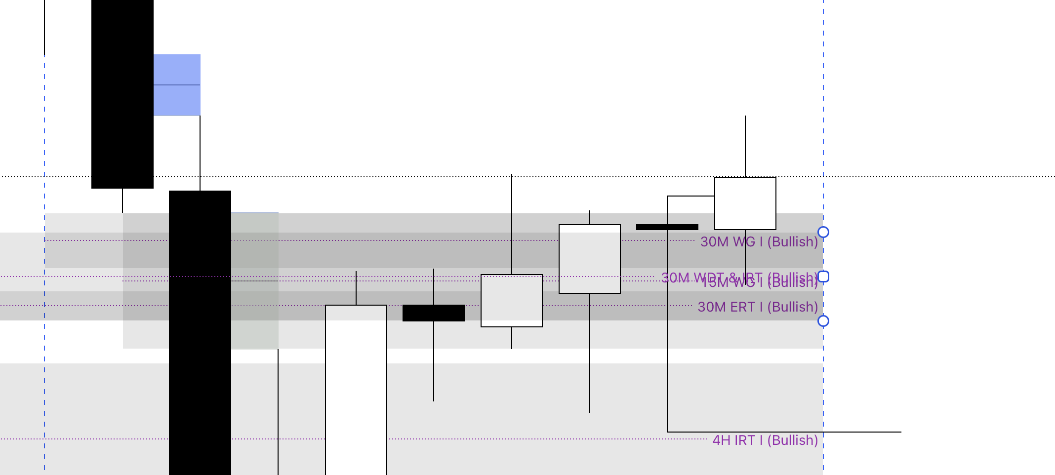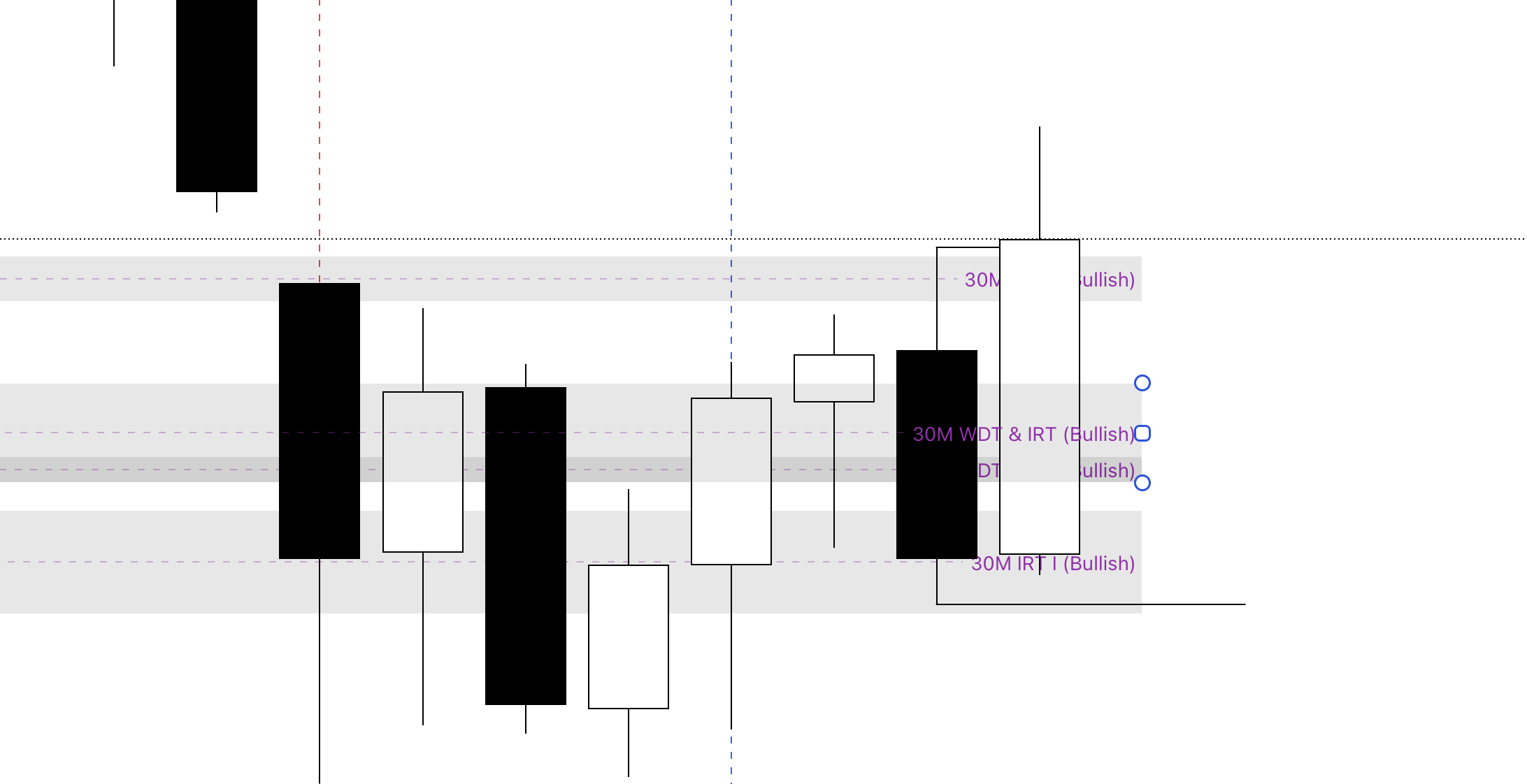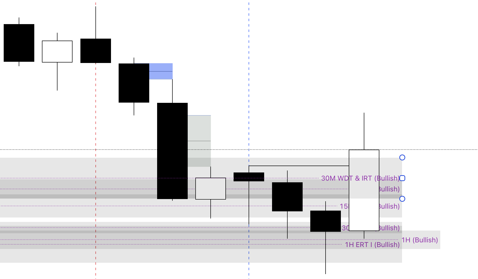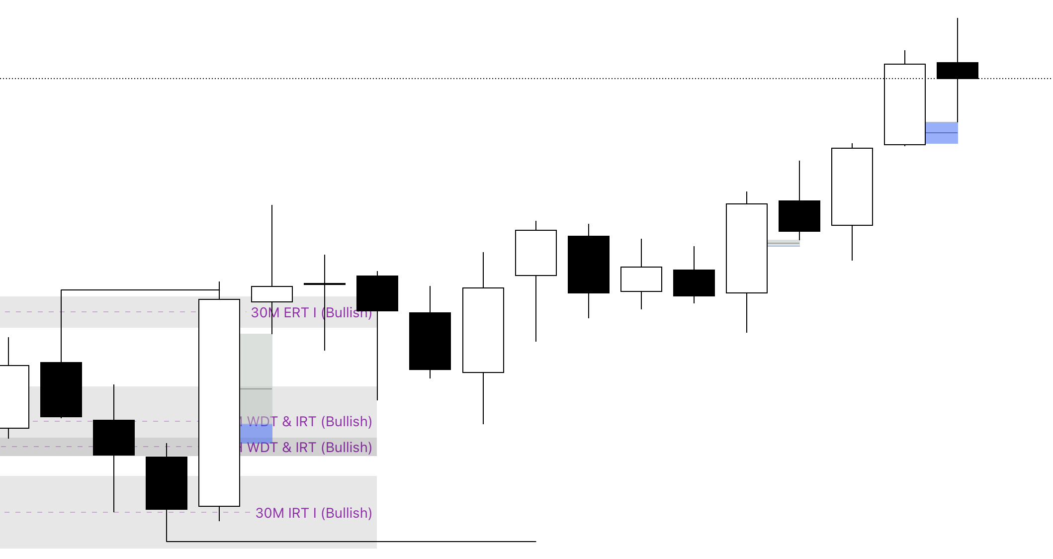 Confluences: A 1H bullish FVG beneath a 30M WDT & IRT bullish FVG.