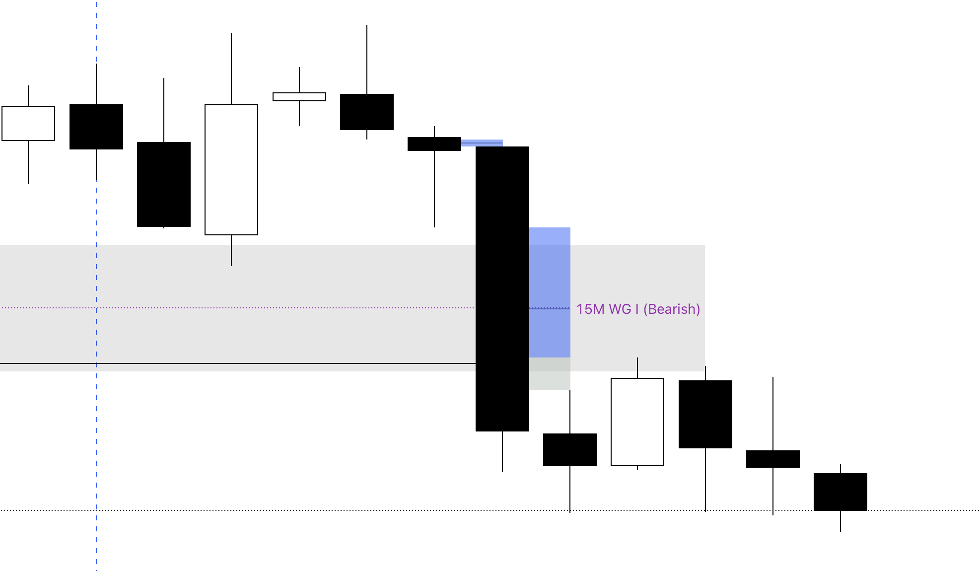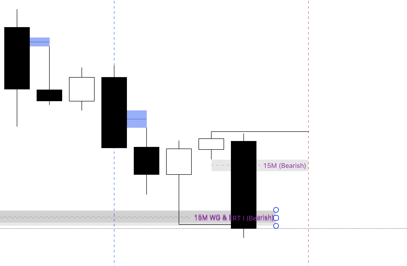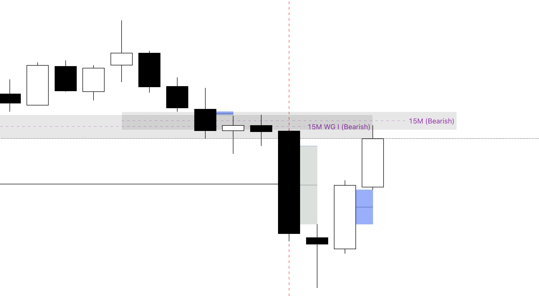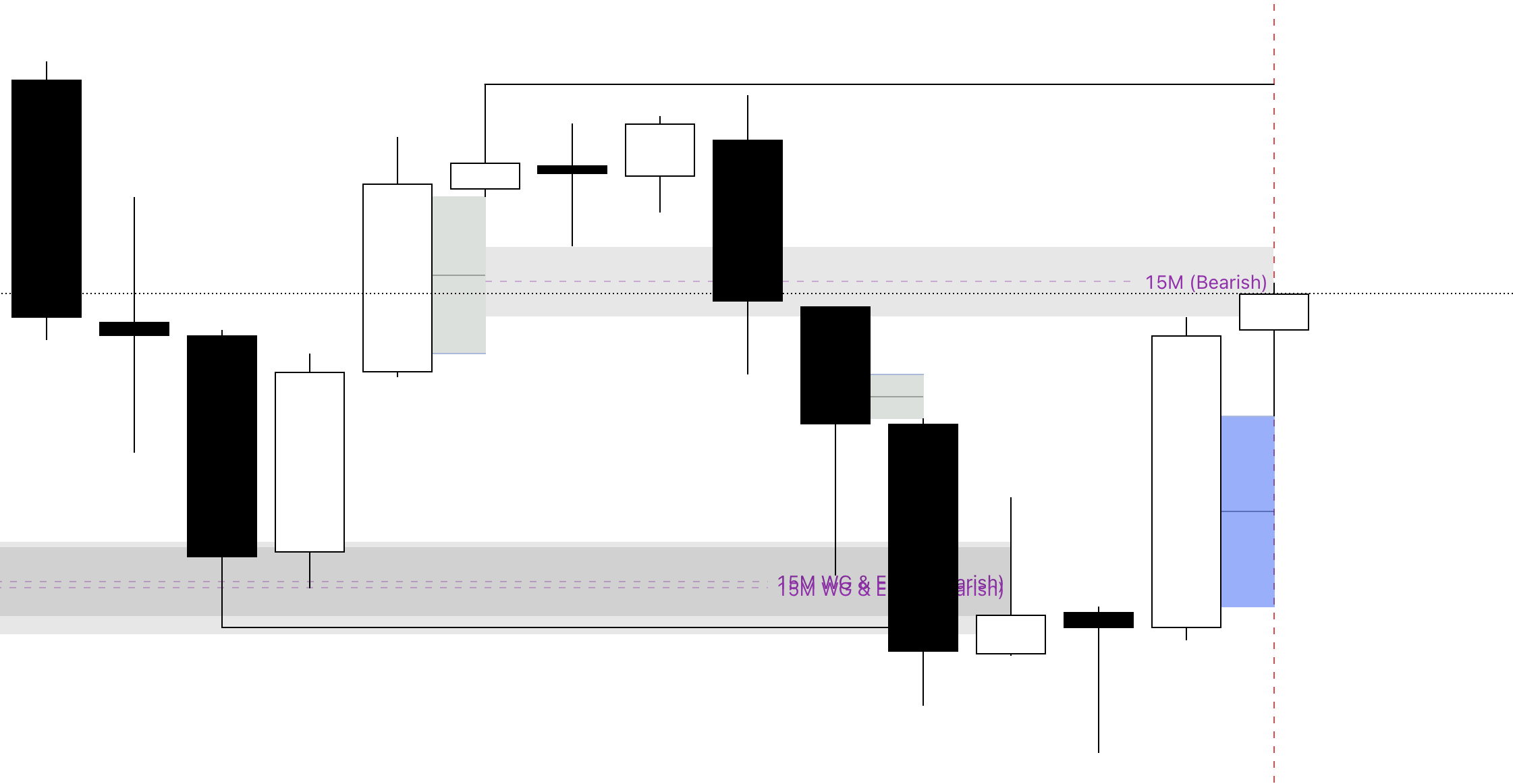Confluences: A 15M bearish FVG above a bearish; 15M WG Inverse FVG.