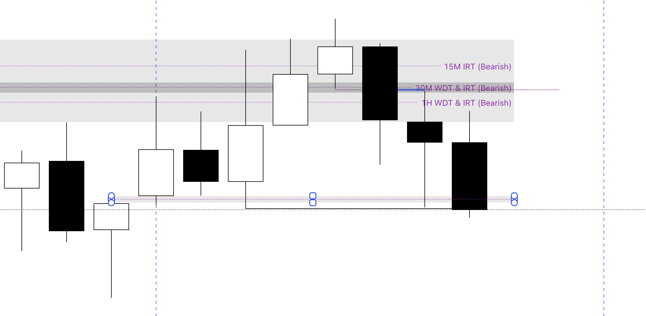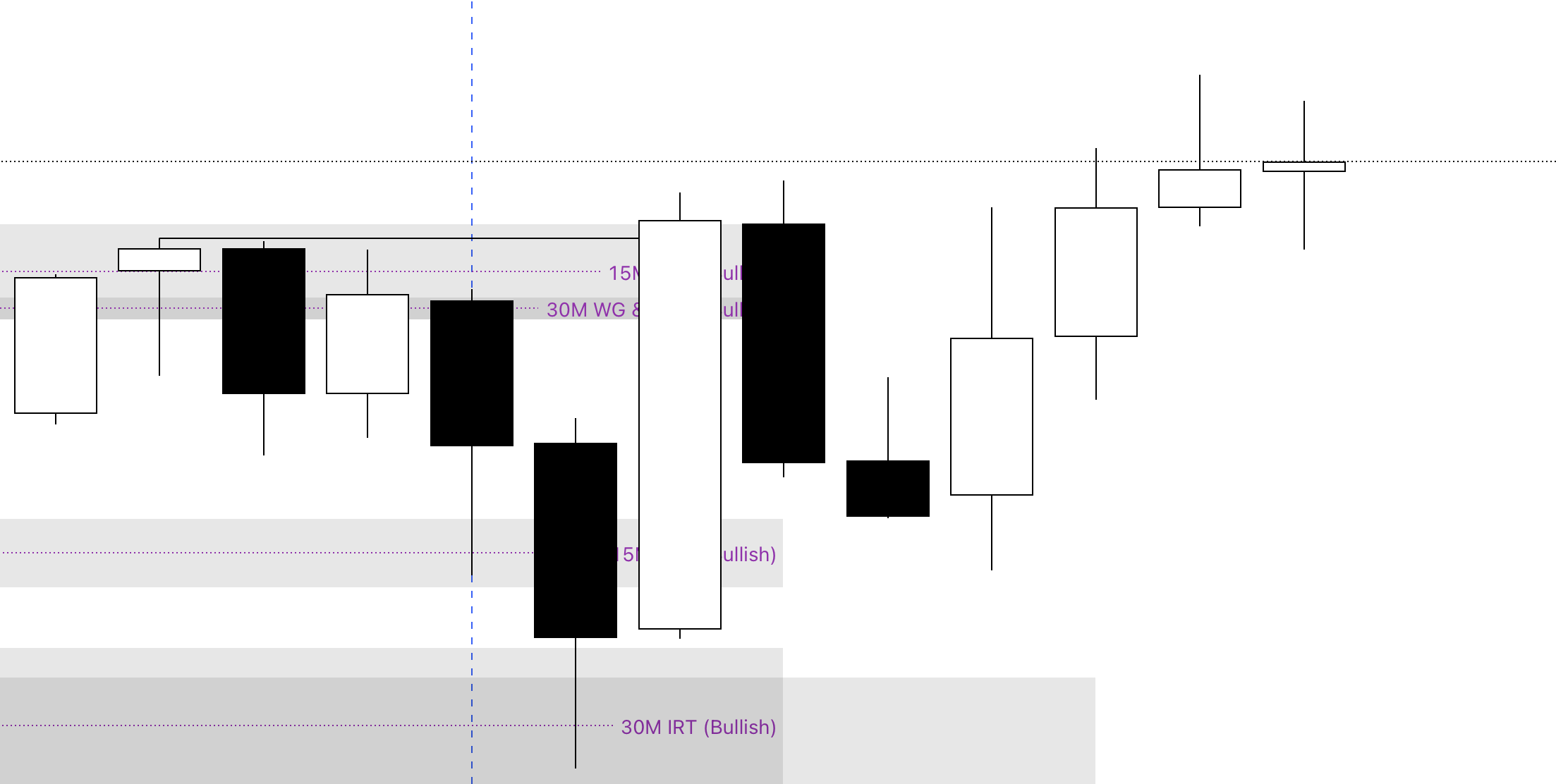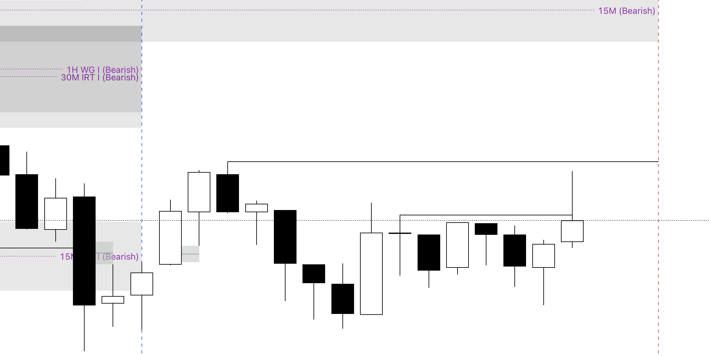 Confluences: A 30M IRT bearish inverse FVG and 15M IRT bearish inverse FVG at the same level above a 15M WG bearish inverse FVG.