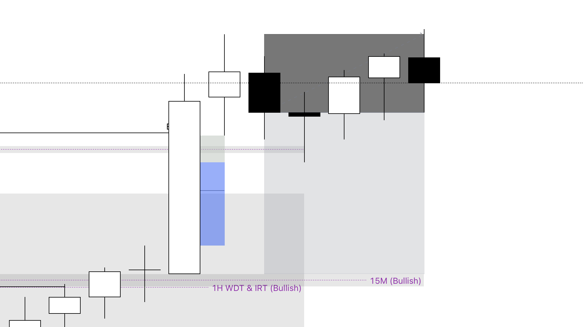 Confluences: A 1H WDT & IRT bullish FVG beneath a 15M WG bullish inverse FVG.
