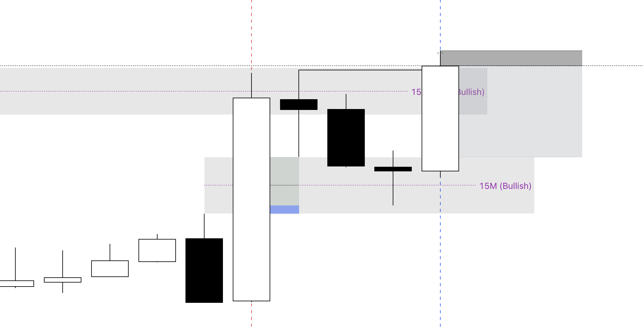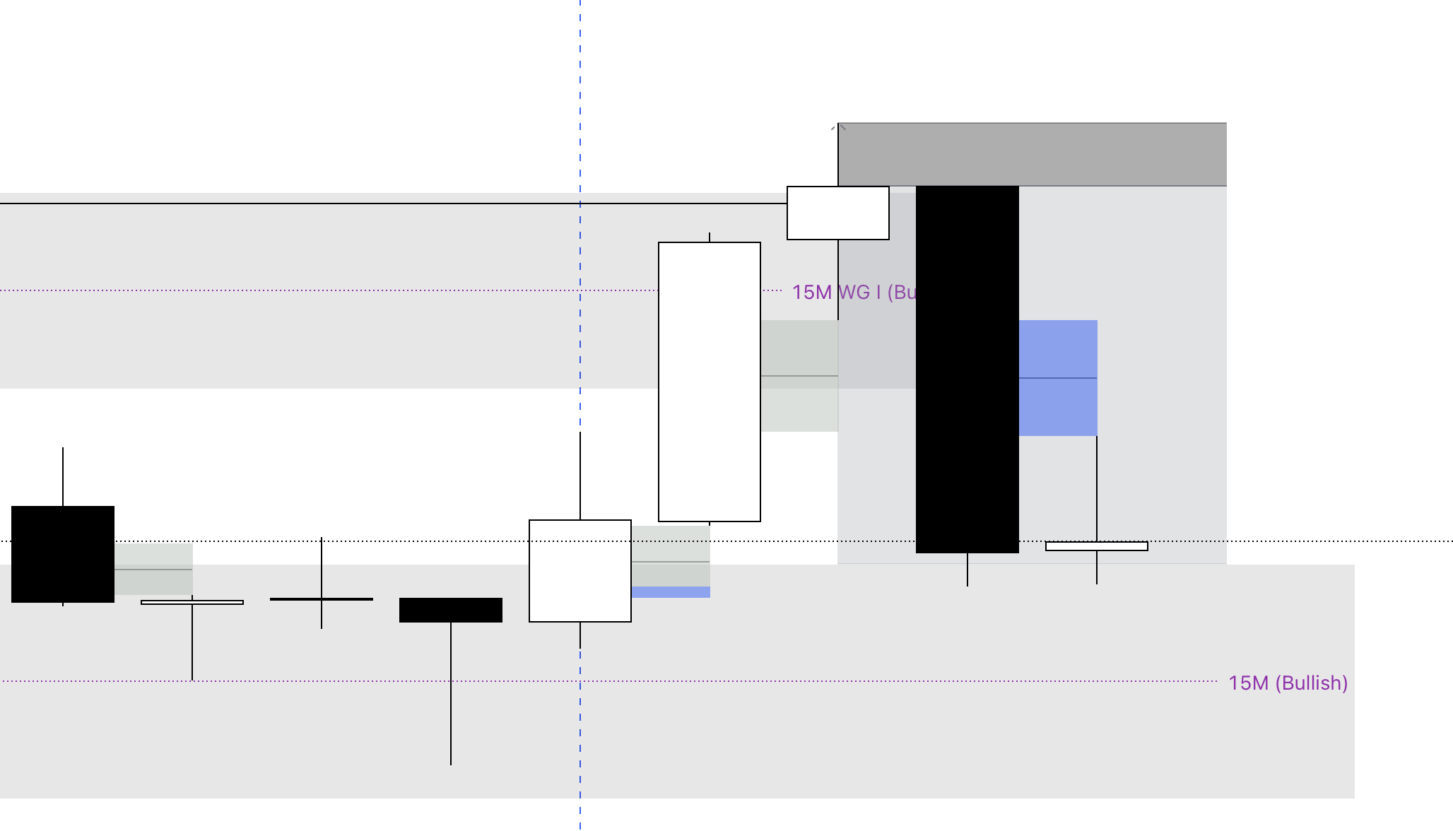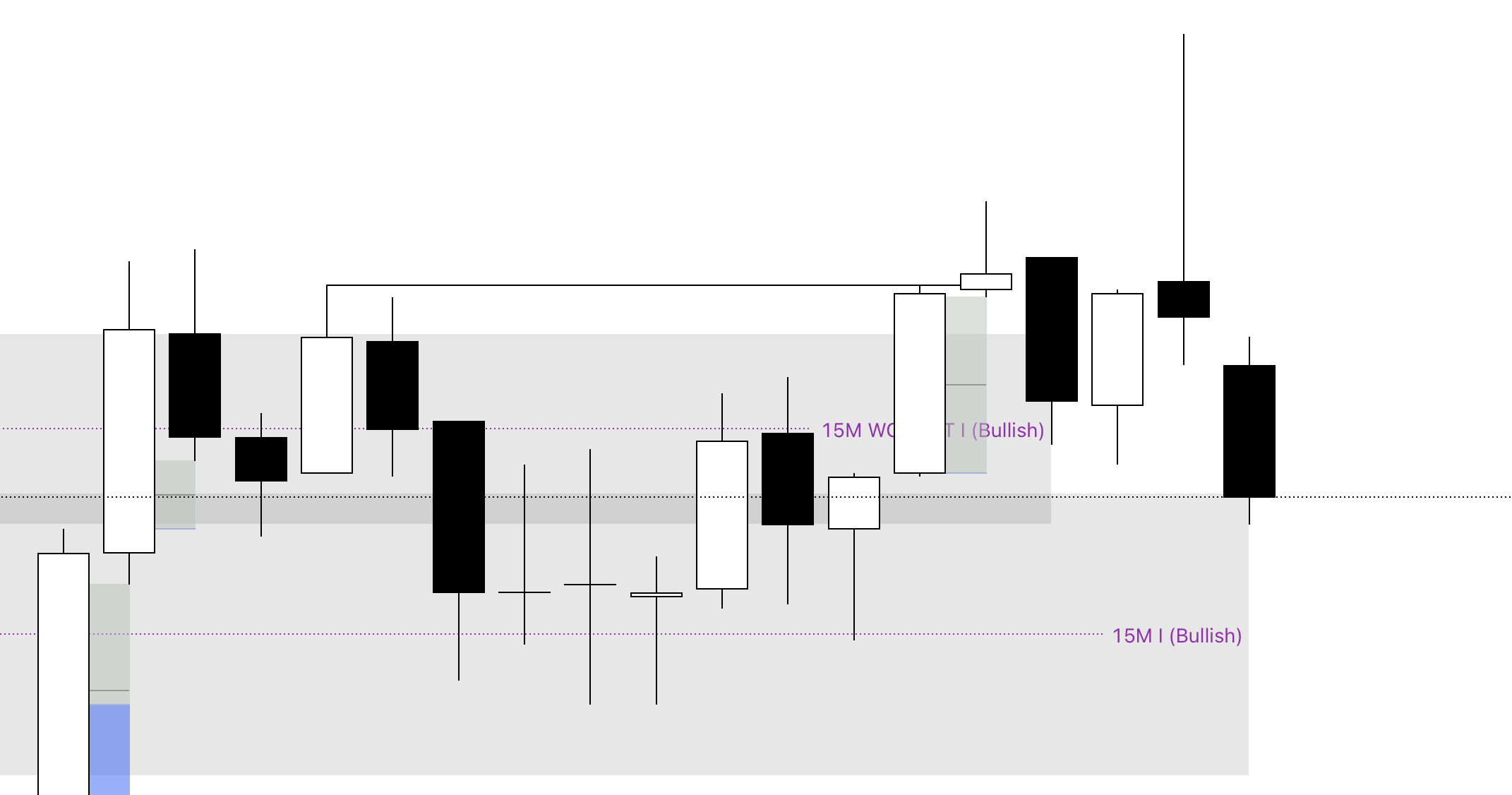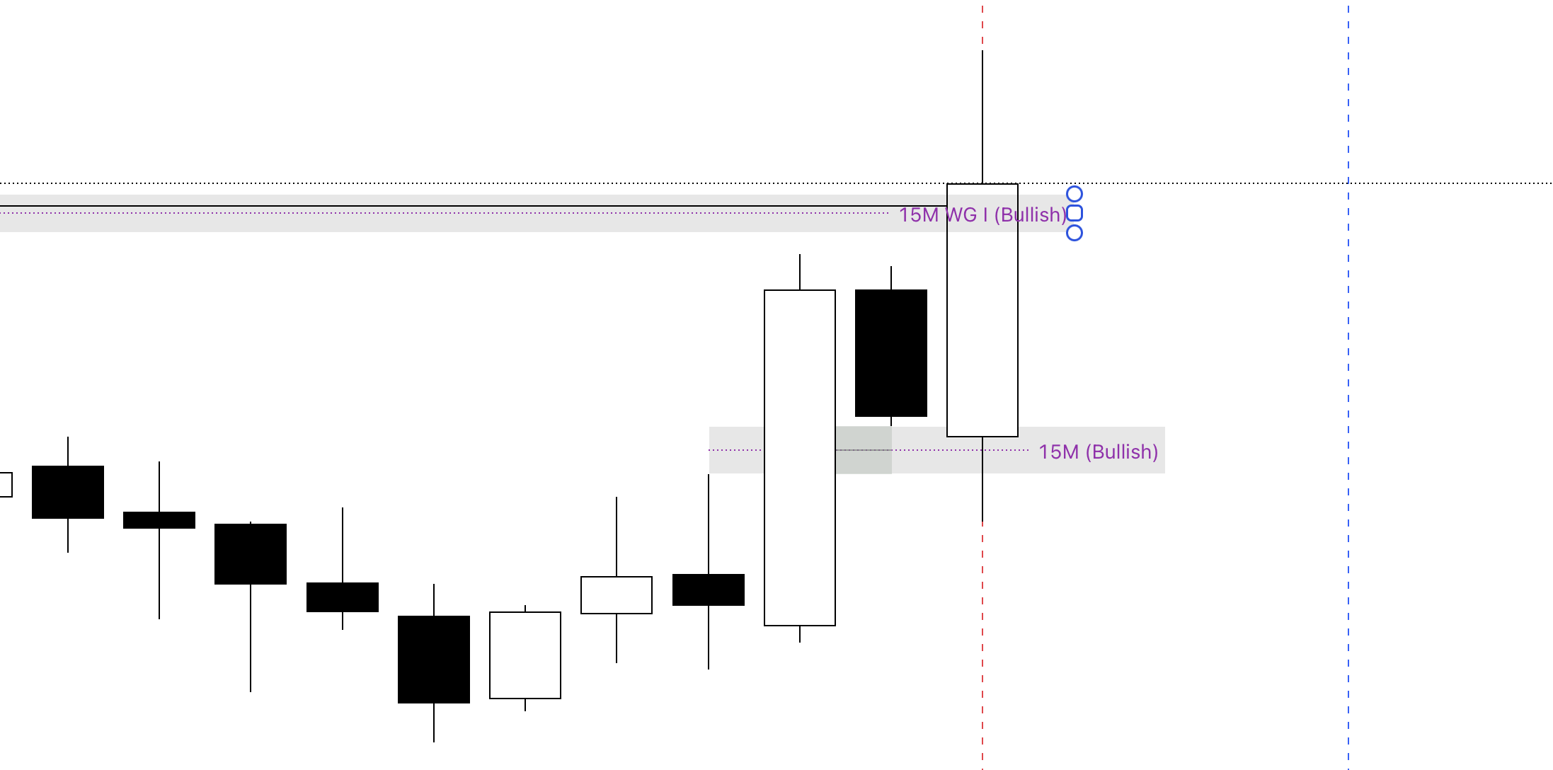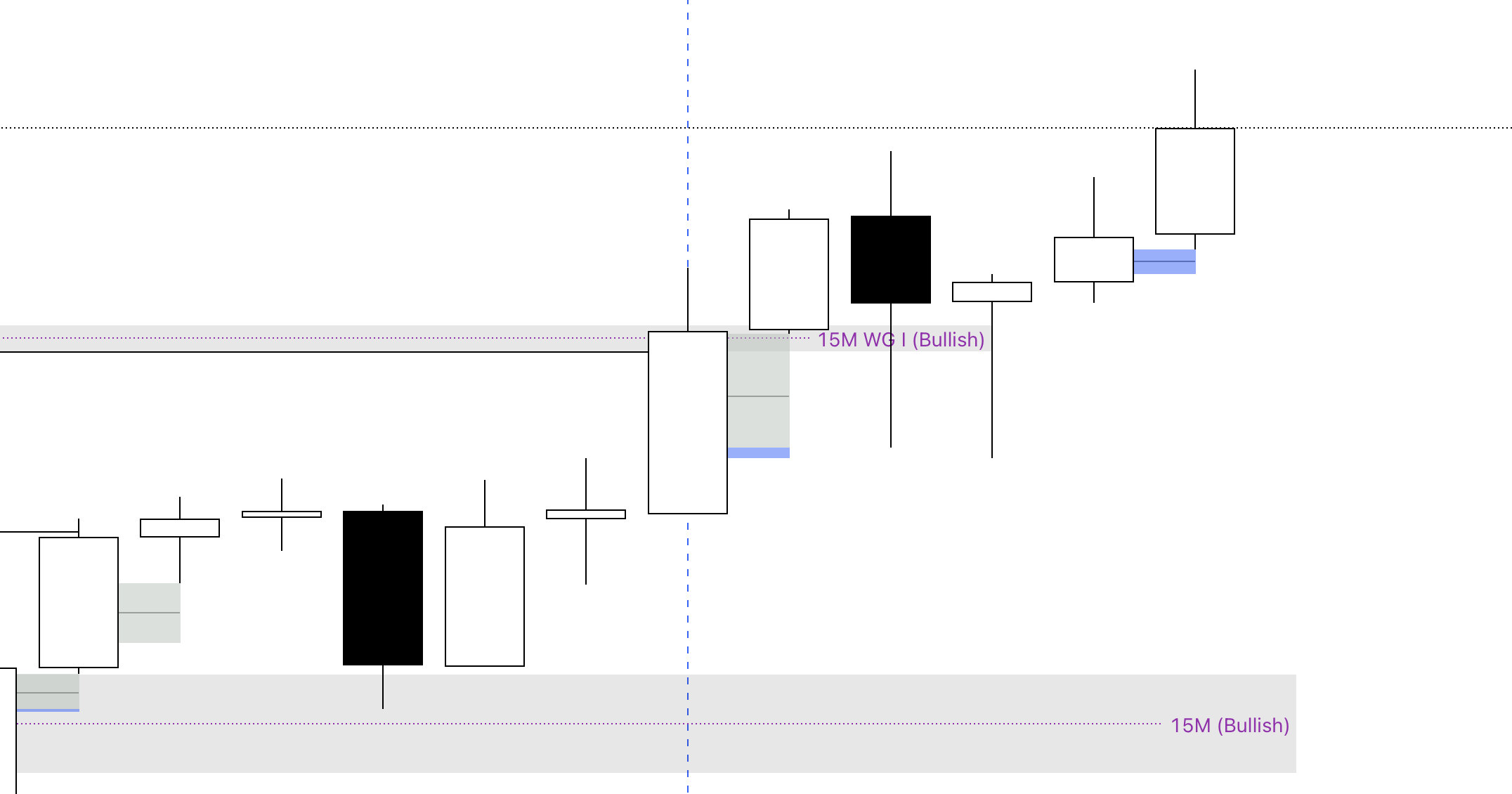 Confluences: A 15M bullish FVG beneath a 15M WG bullish inverse FVG.