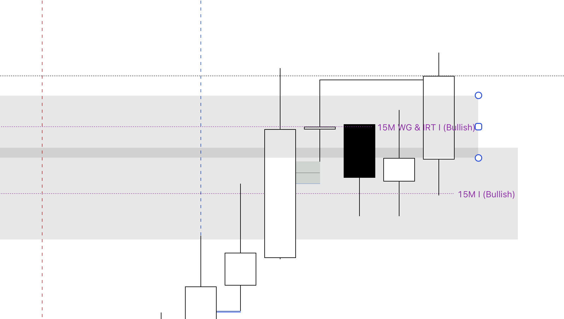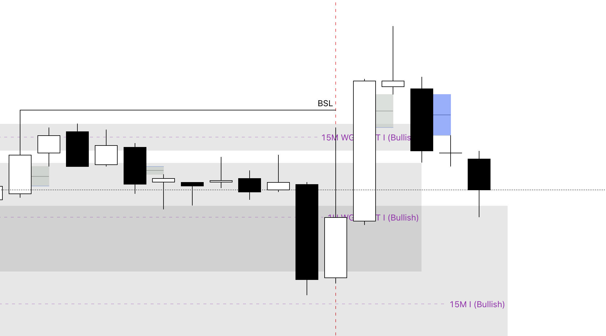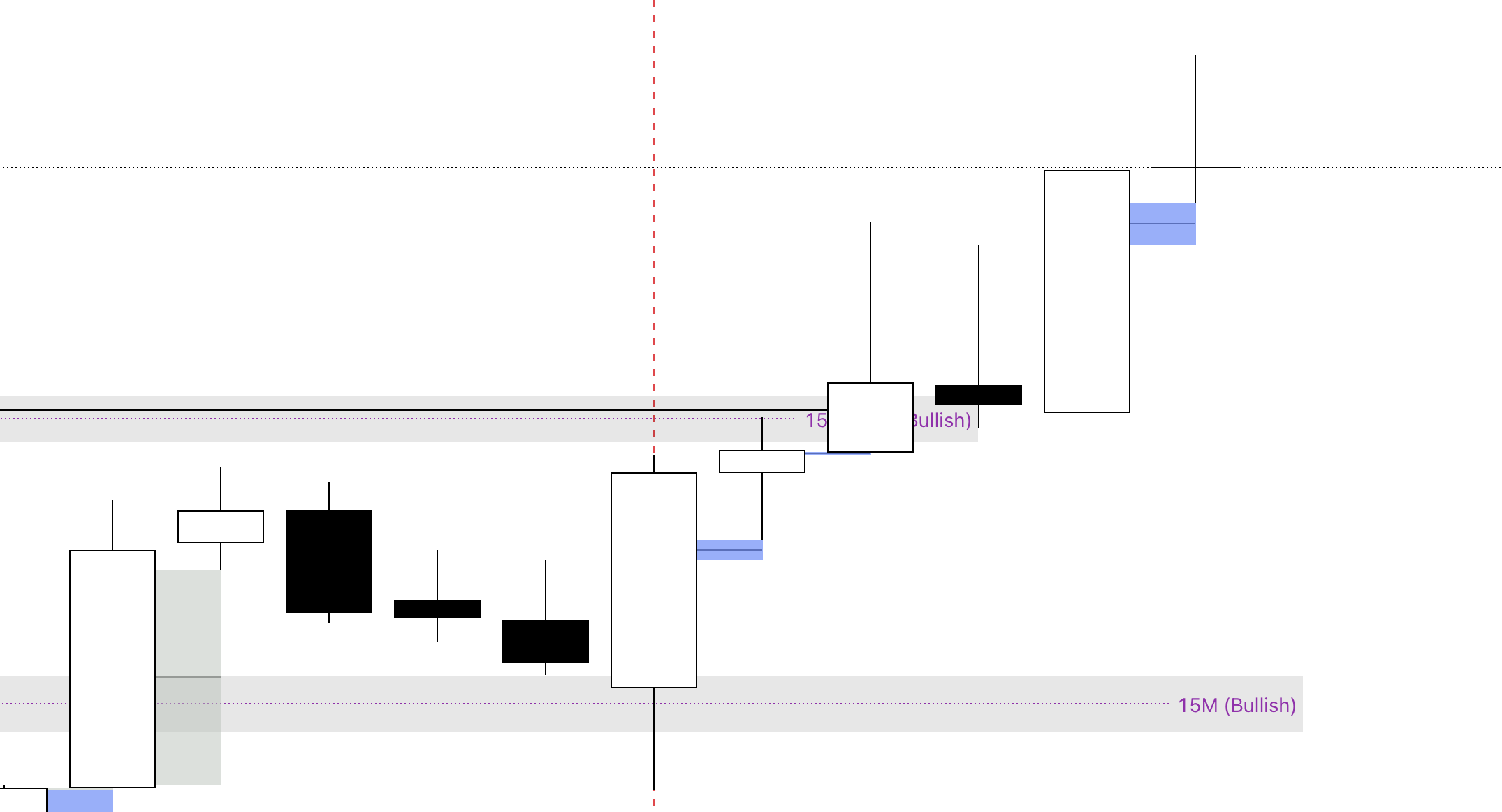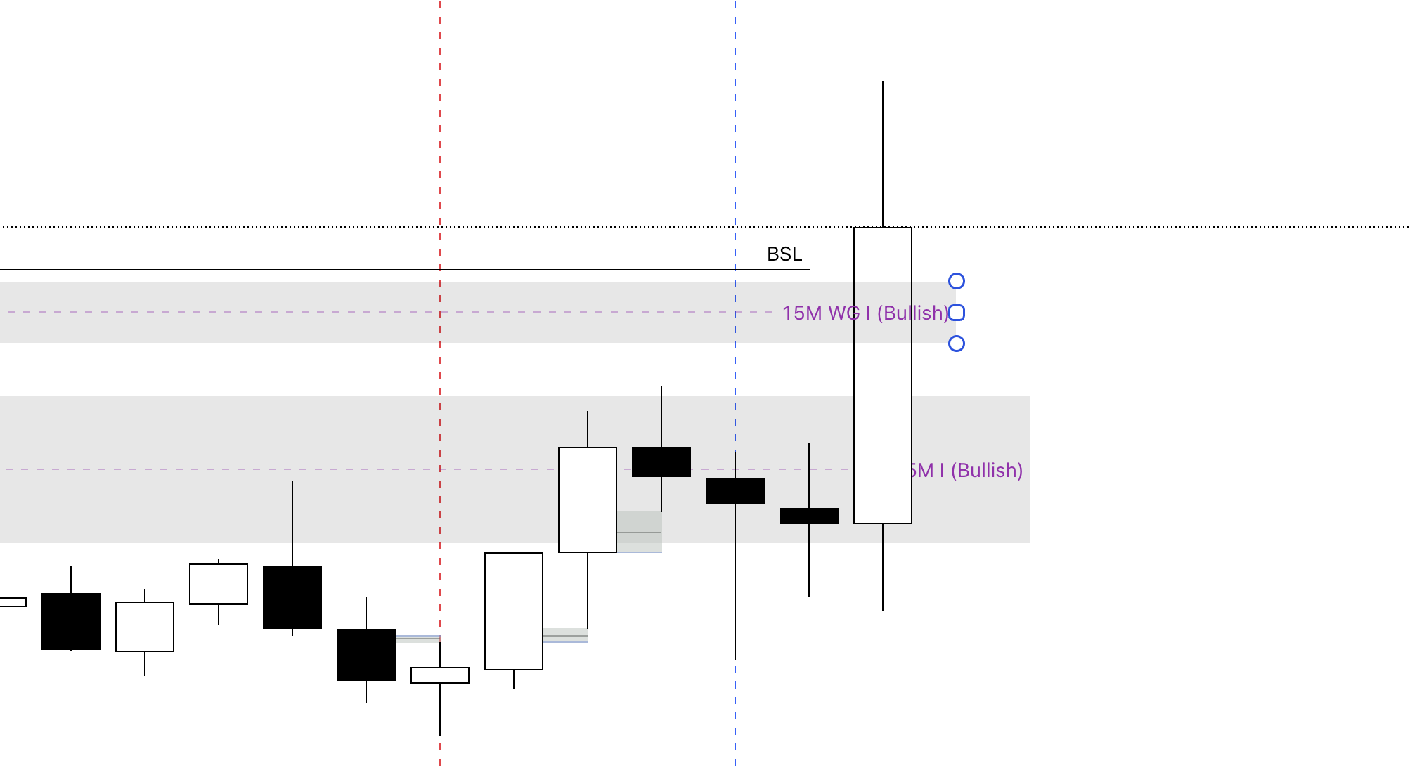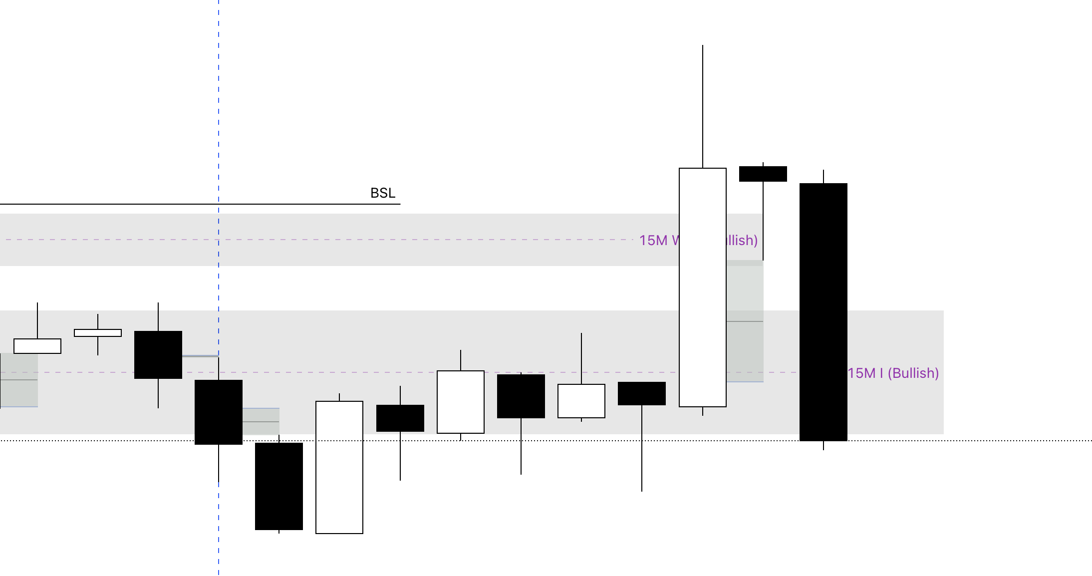 Confluences: A 15M bullish FVG beneath a 15M WG bullish inverse FVG.