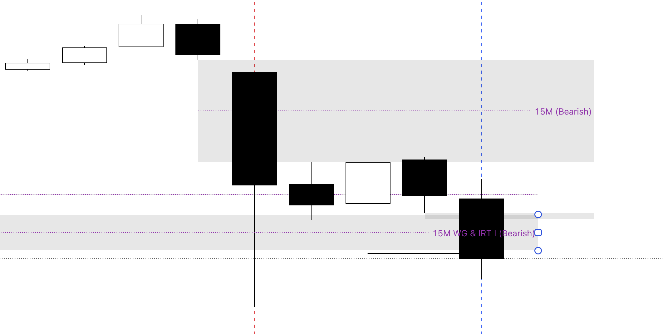 Confluences: A 15M IRT bearish inverse FVG above a 15M WG bearish inverse FVG.