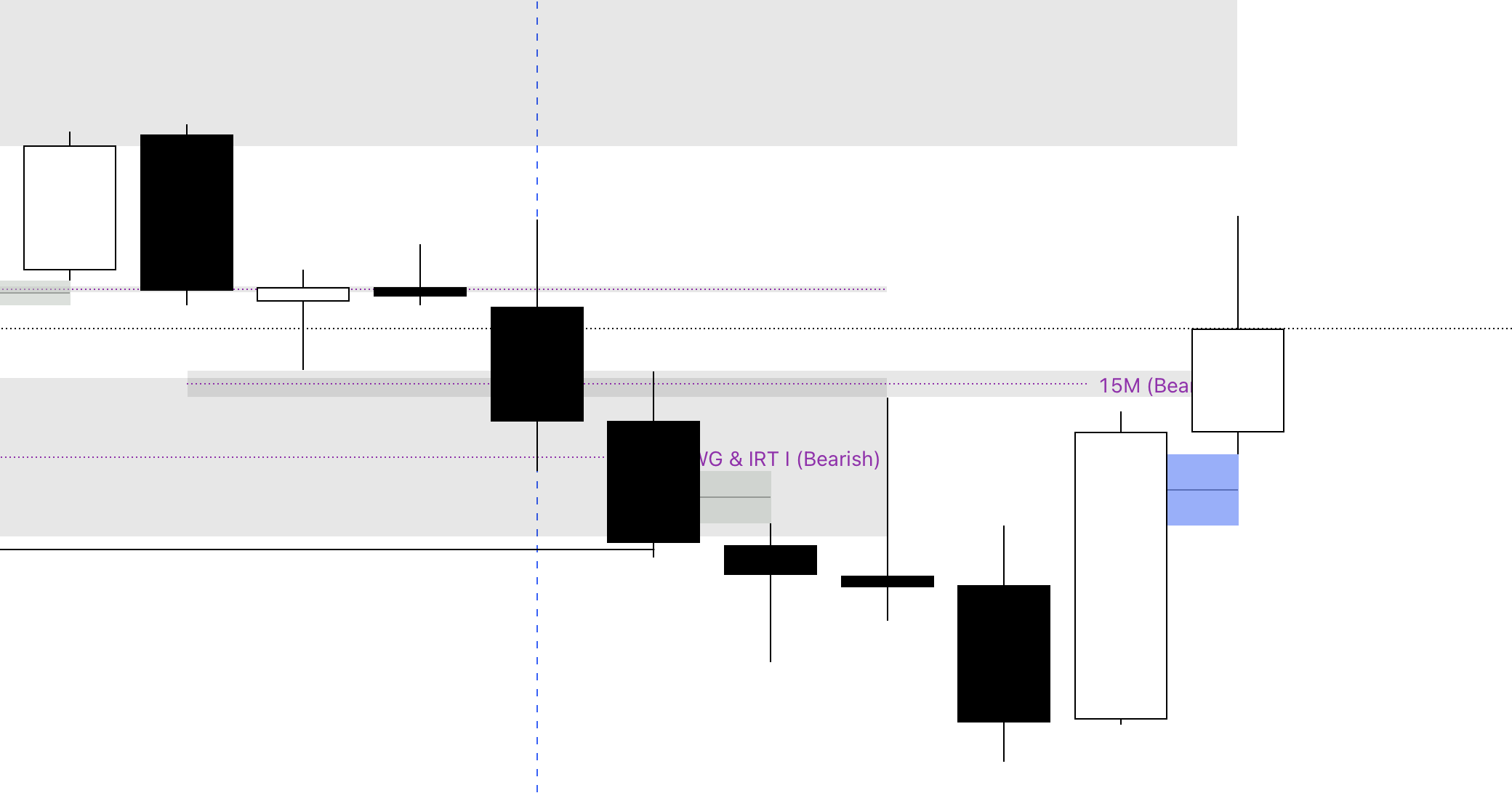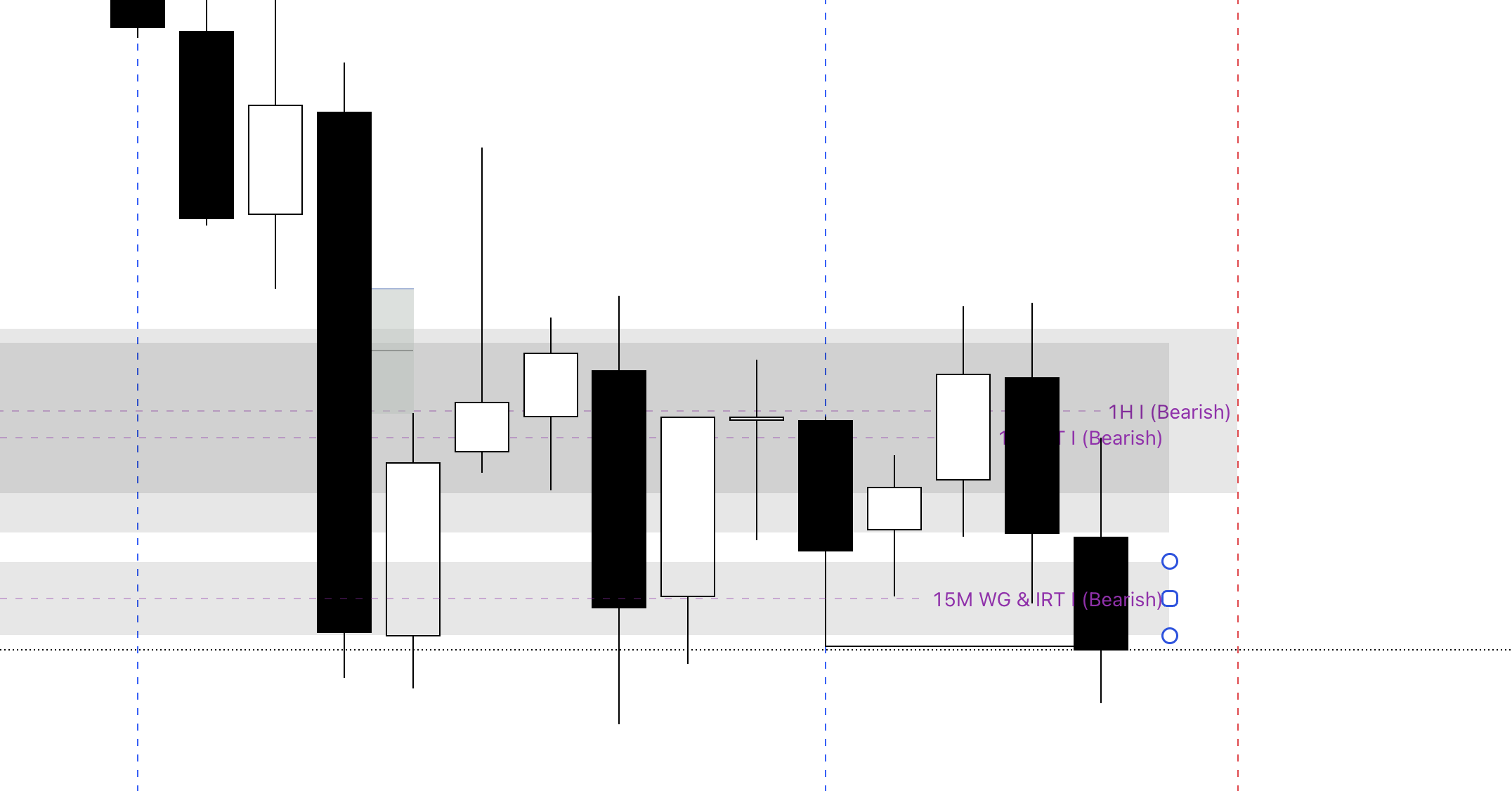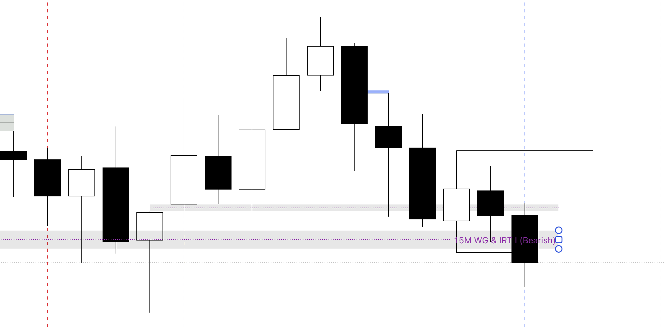 Confluences: A 15M IRT bearish inverse FVG above a bearish; 15M WG inverse FVG.