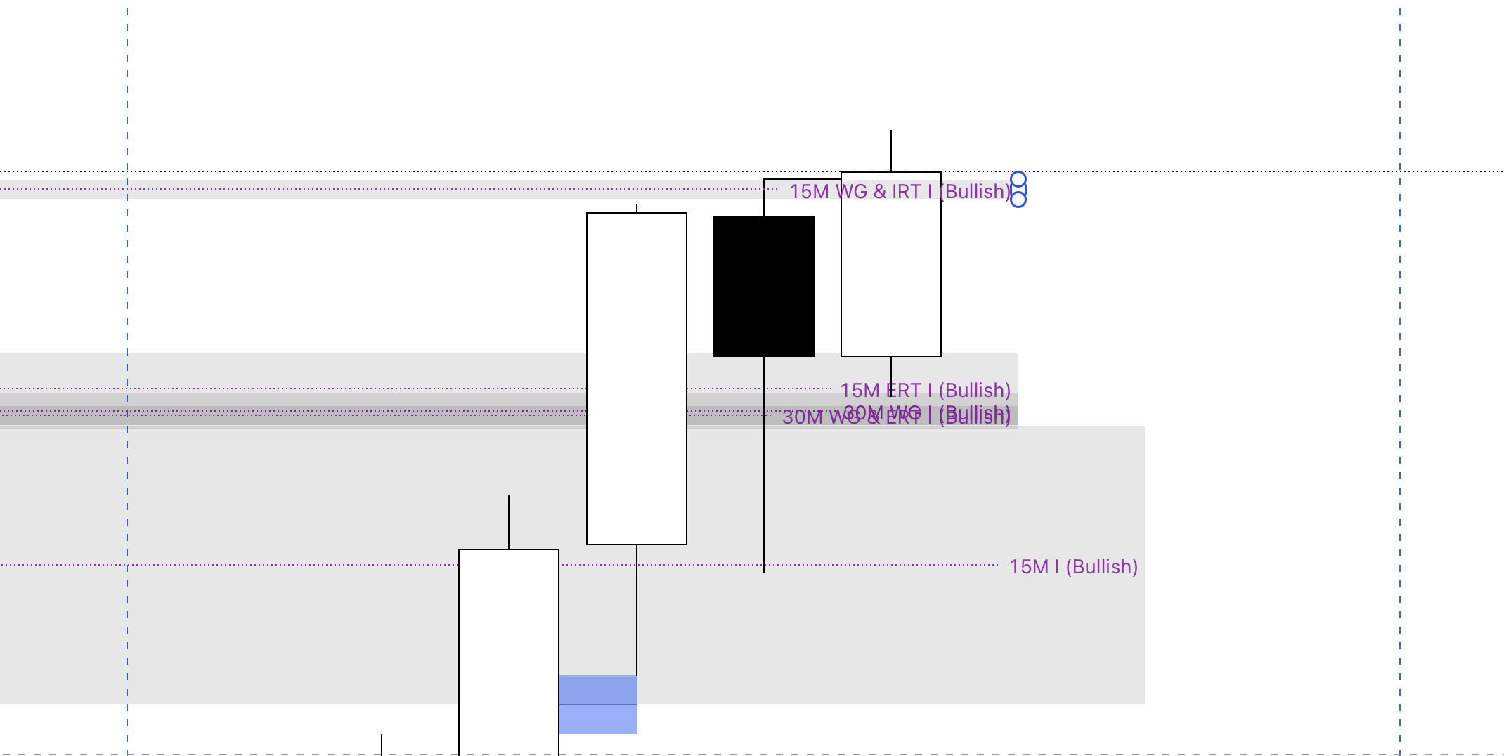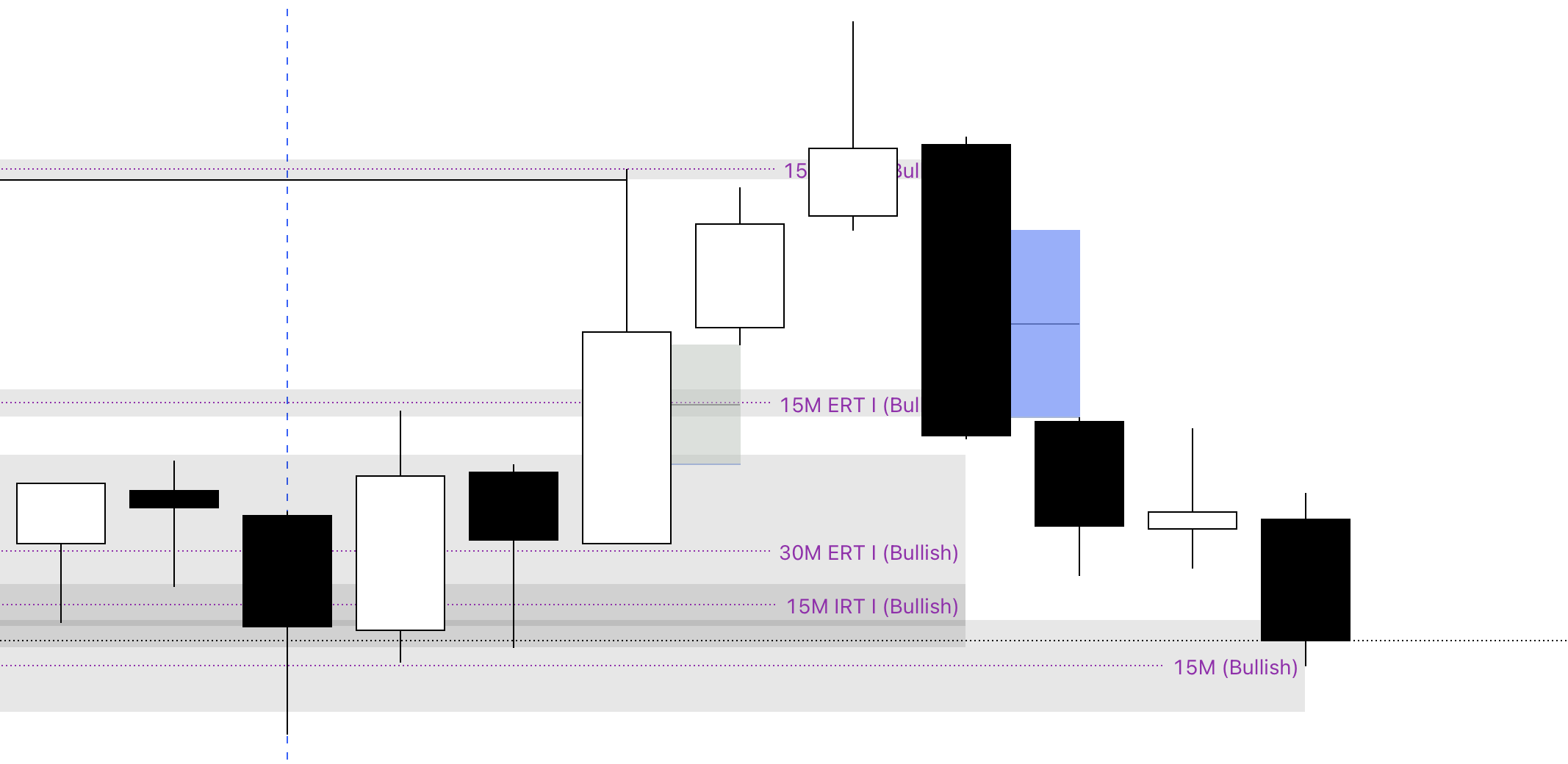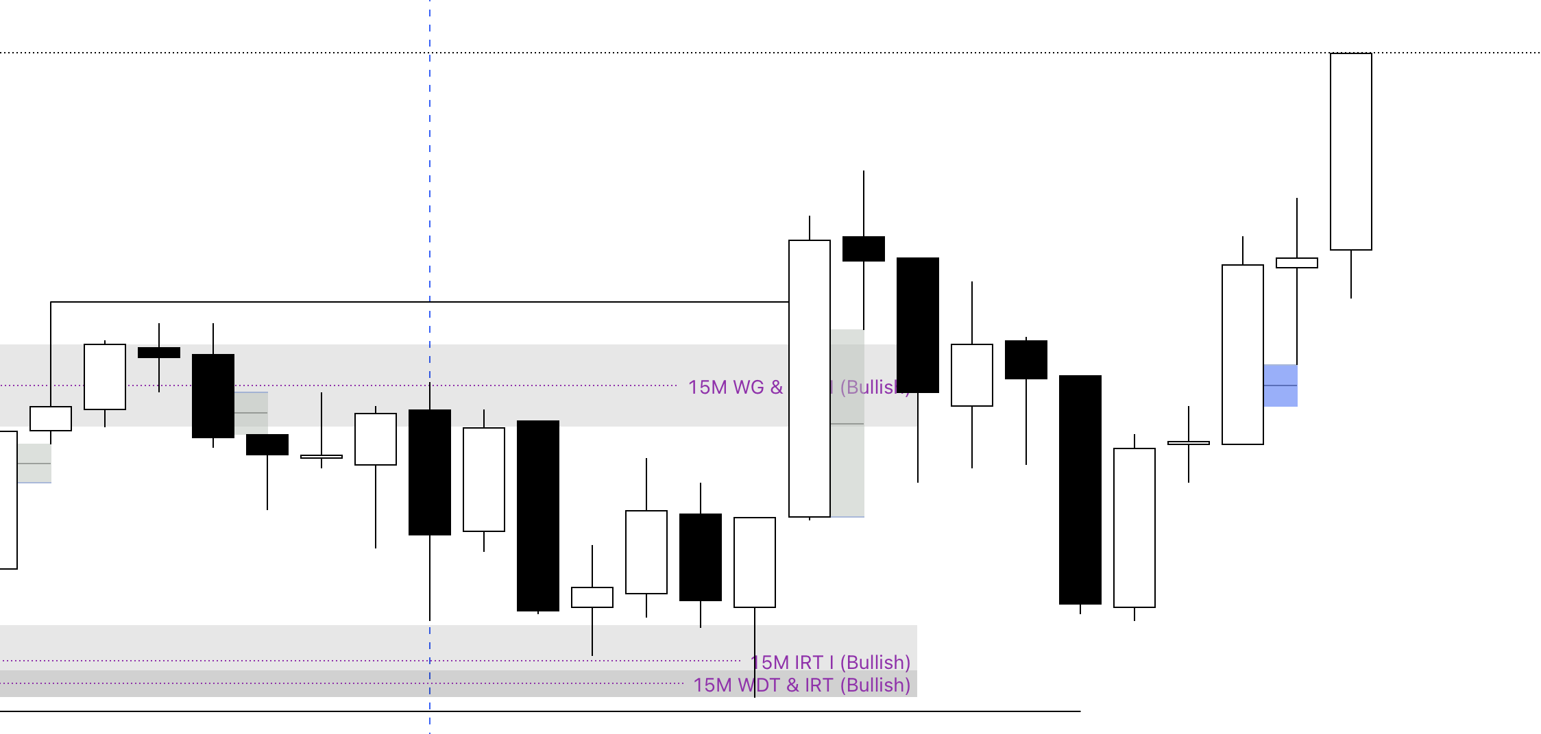 Confluences: A 15M IRT bullish FVG beneath a bullish; 15M WG & ERT inverse FVG.