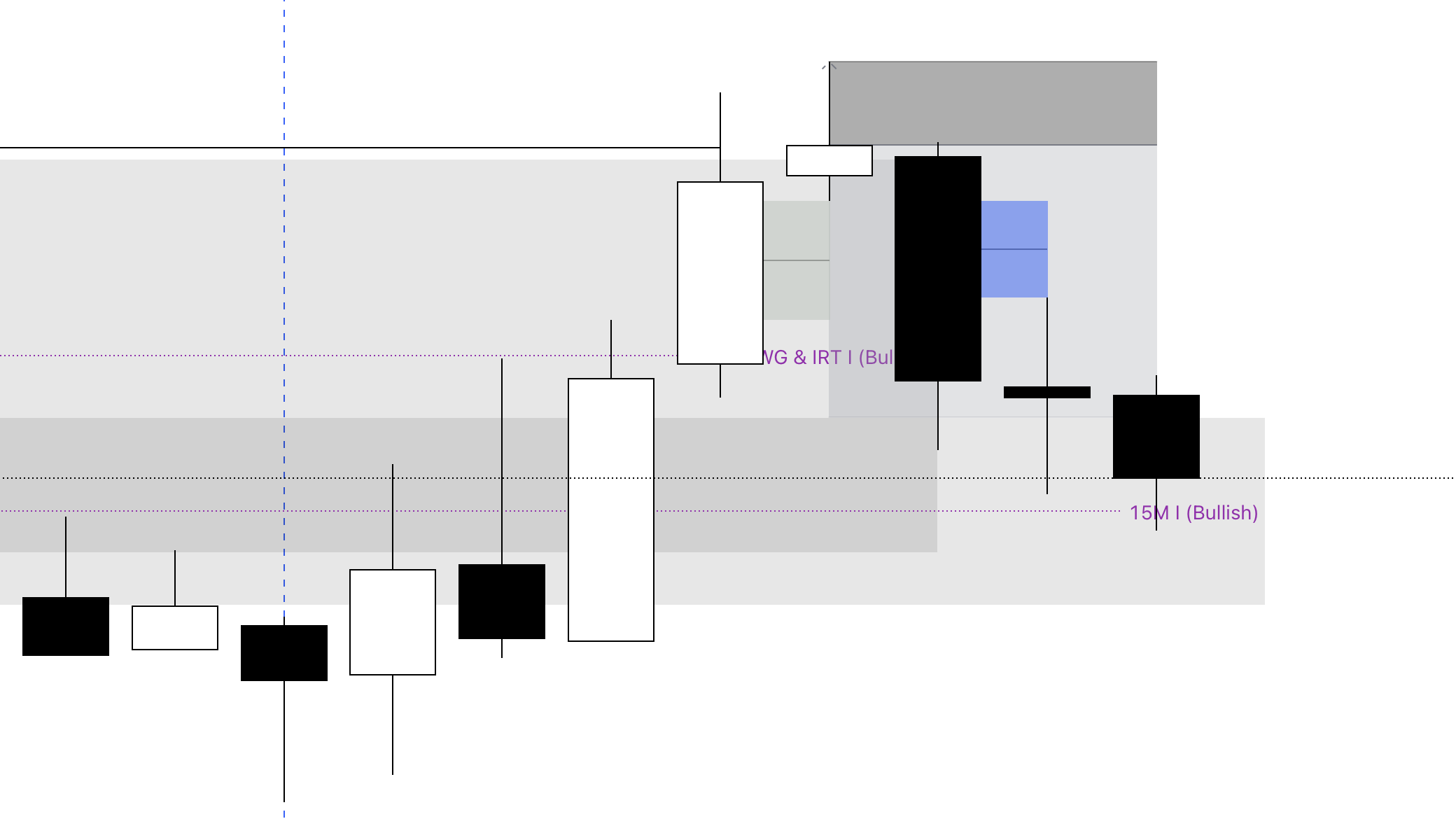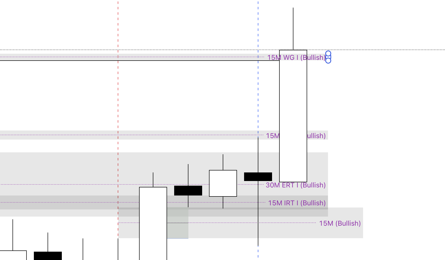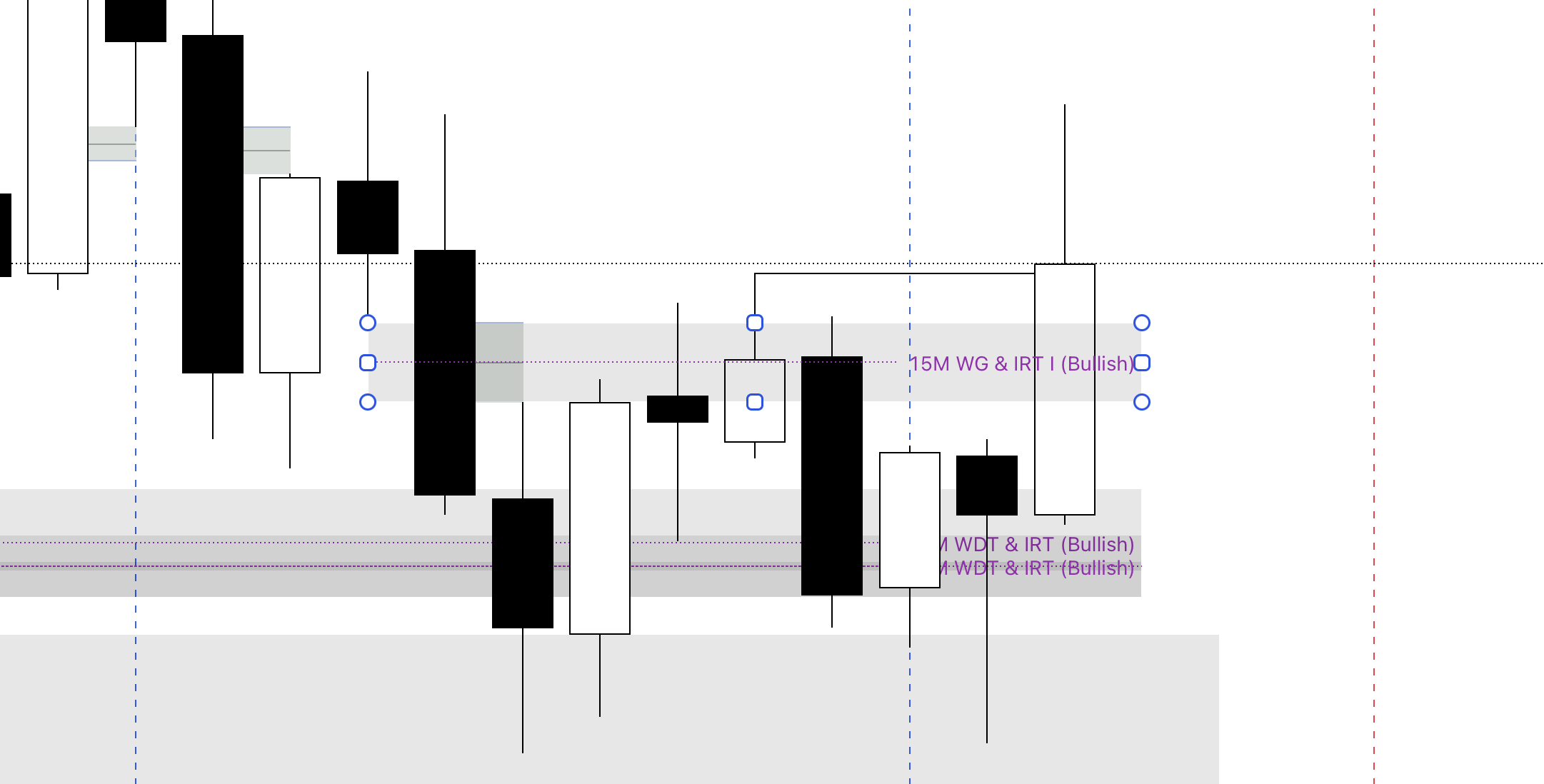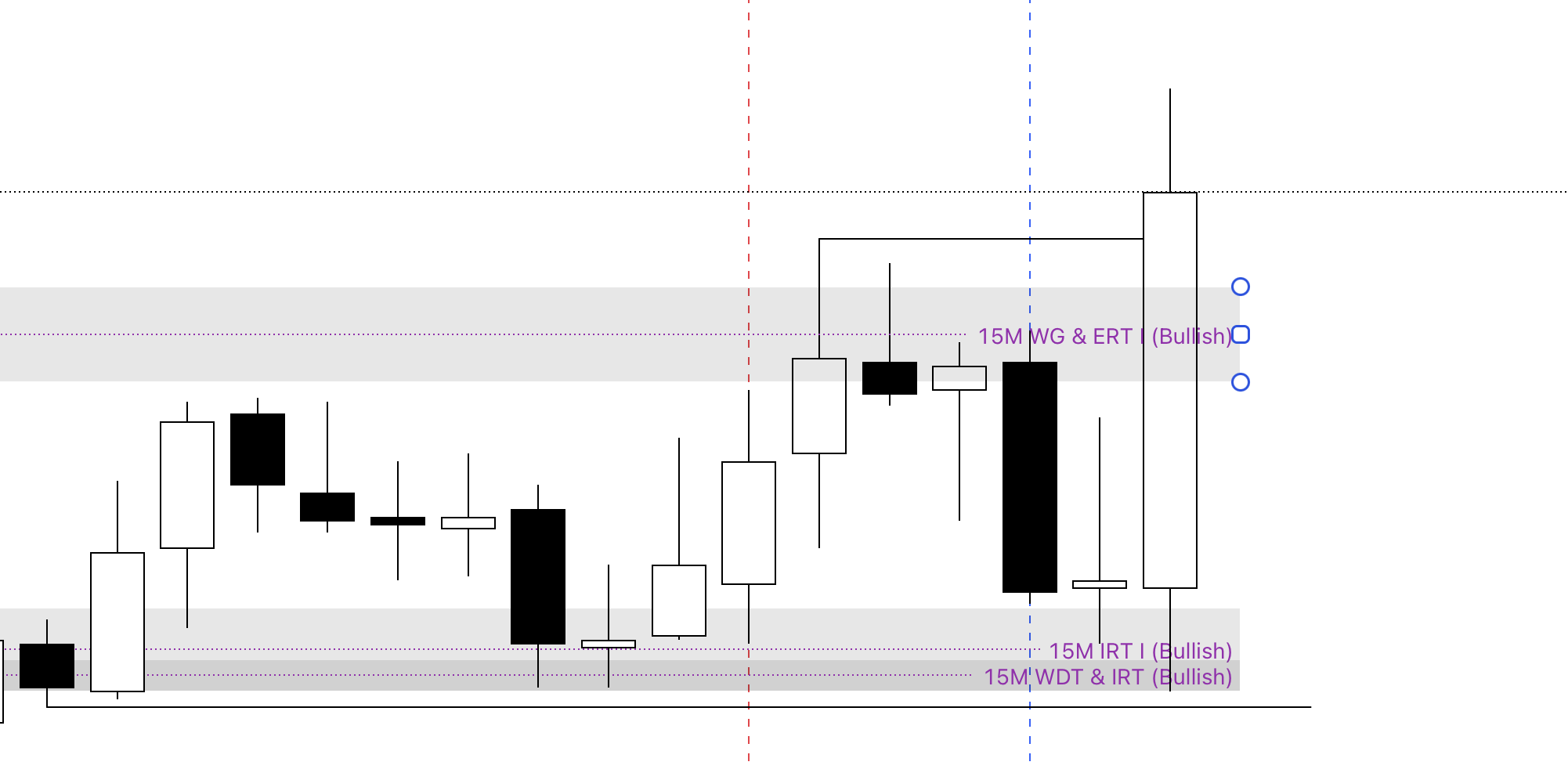 Confluences: A 15M IRT bullish FVG beneath a bullish; 15M WG & ERT inverse FVG.