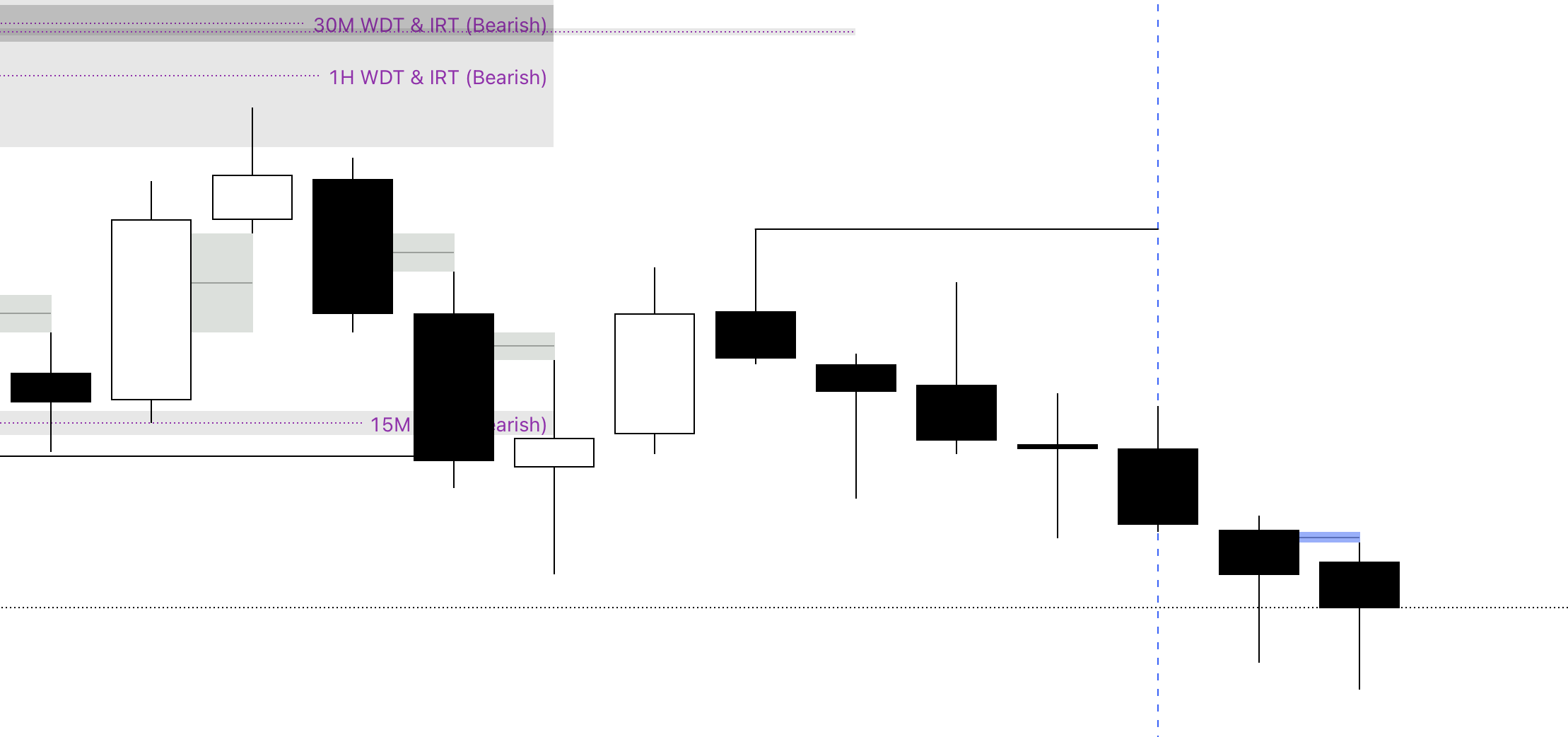 Confluences: A 30M IRT bearish inverse FVG above a bearish; 15M WG inverse FVG.