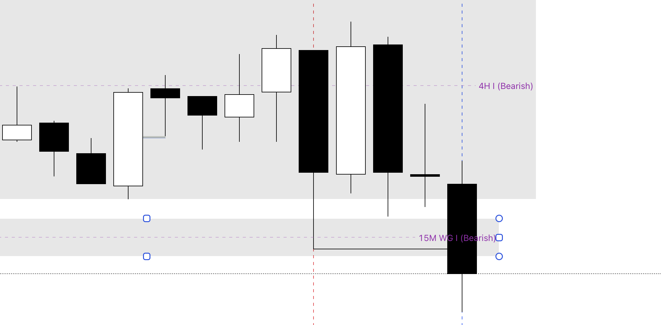 Confluences: A 15M bearish FVG above a 15M WG bearish inverse FVG.