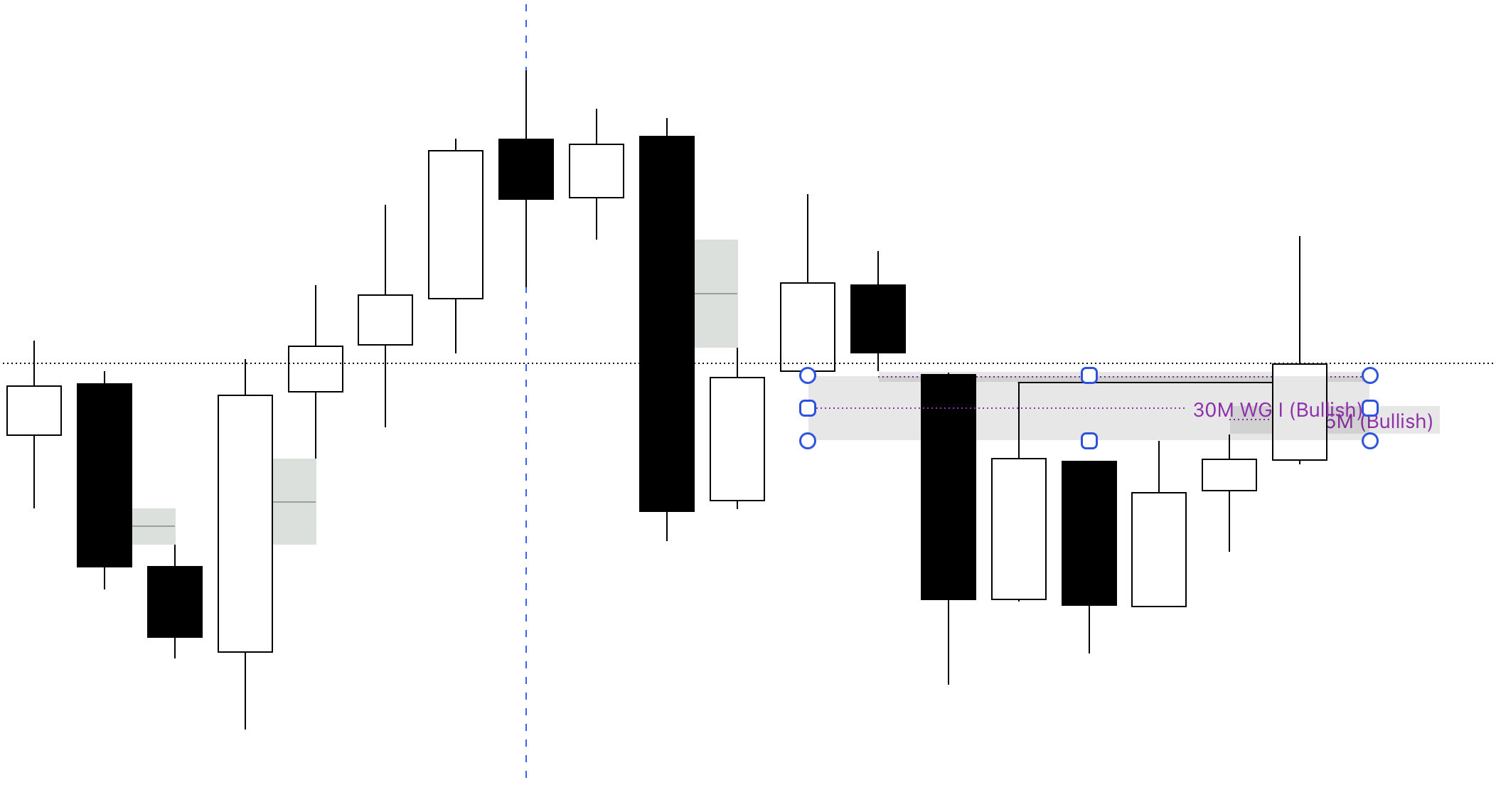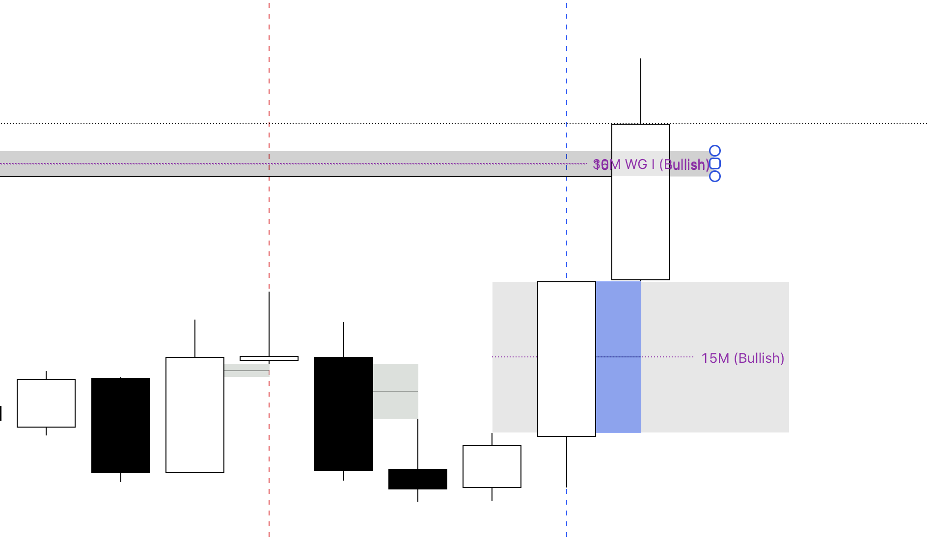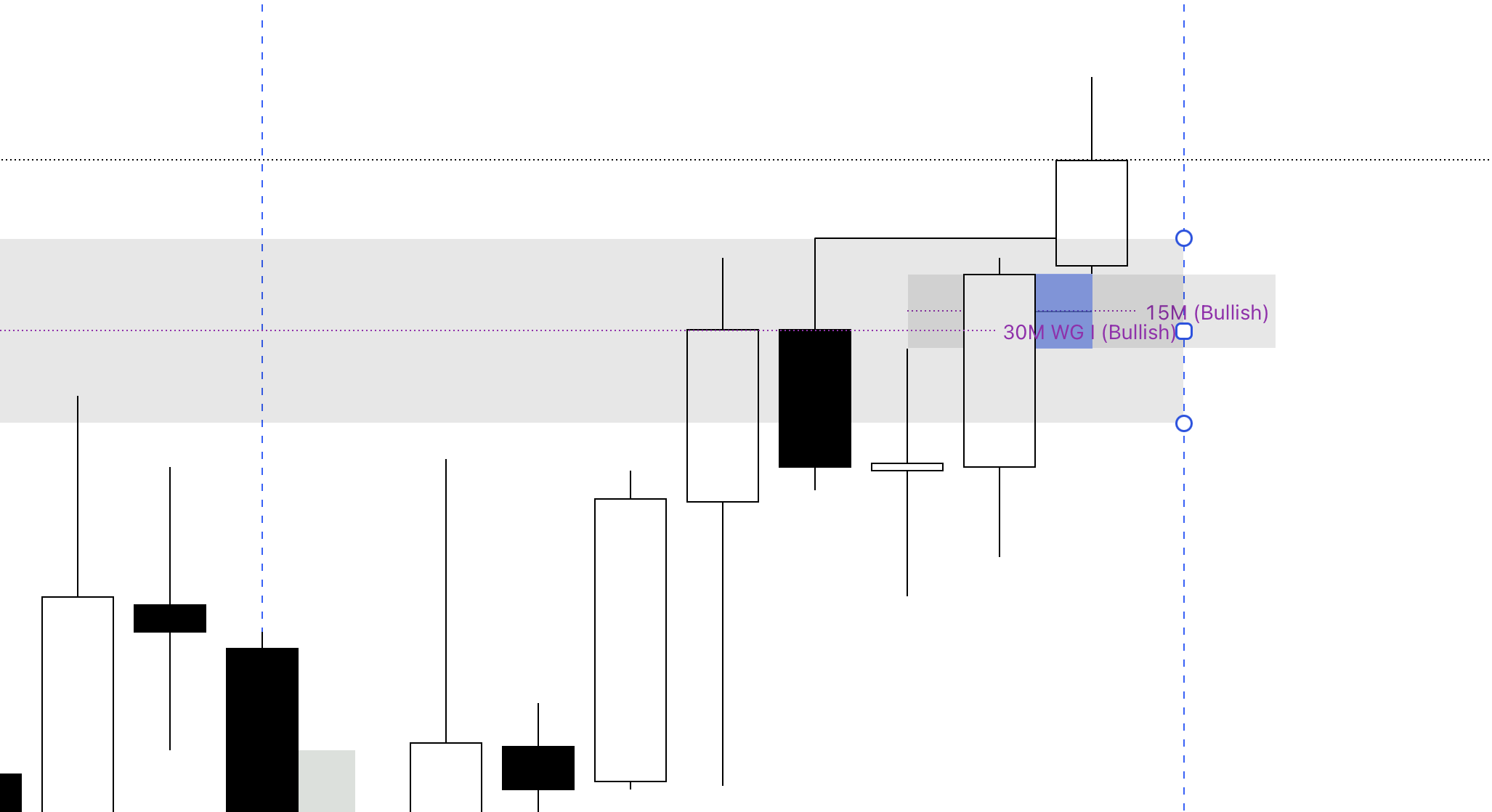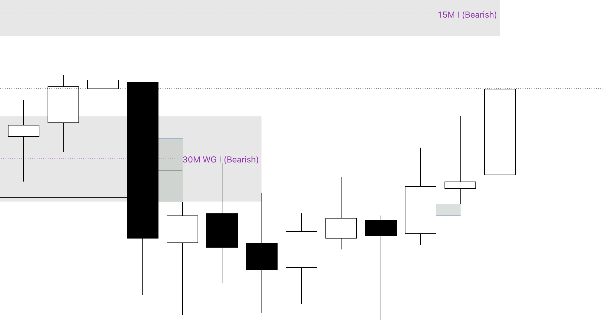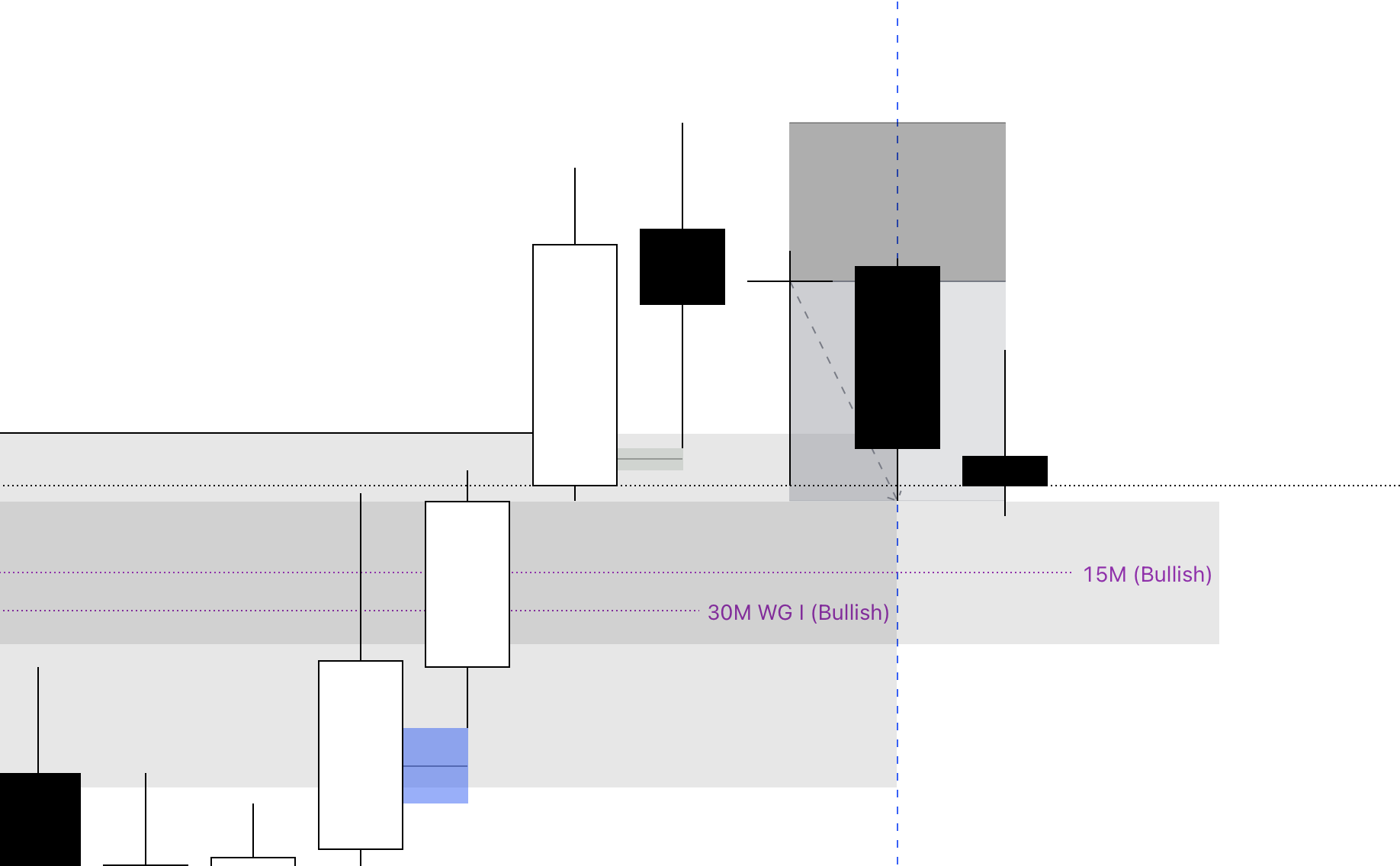 Confluences: A 15M bullish FVG beneath a 30M WG bullish inverse FVG.