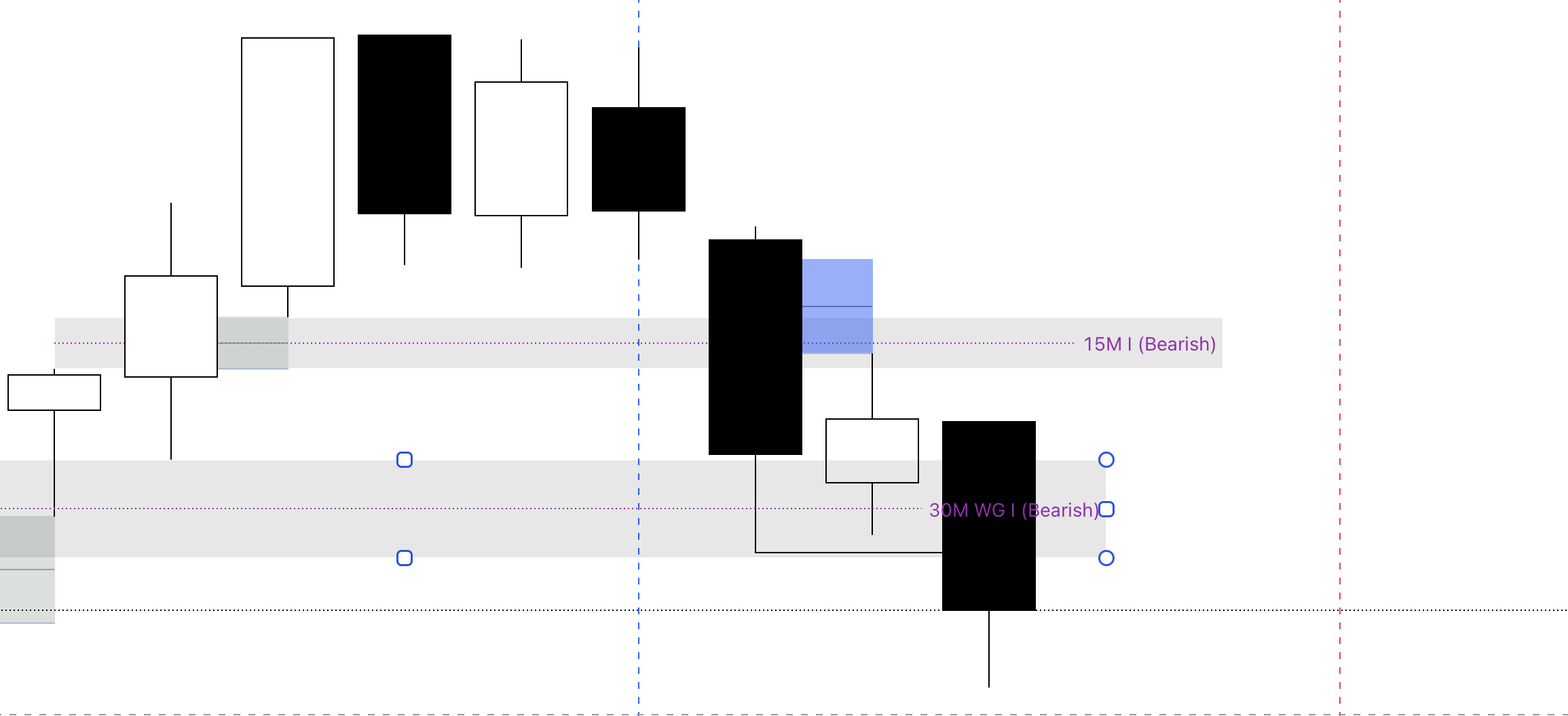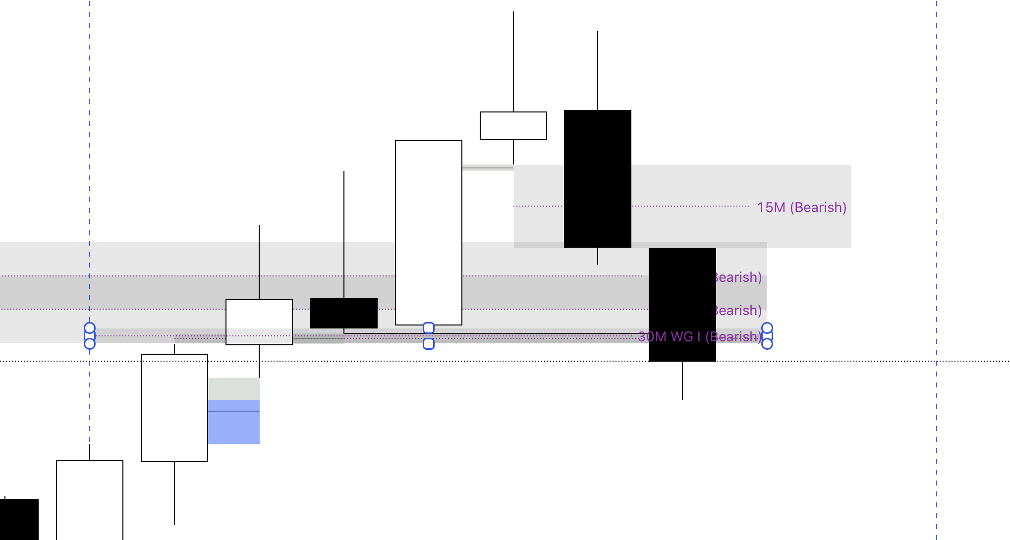 Confluences: A 15M bearish inverse FVG above a bearish; 30M WG inverse FVG.