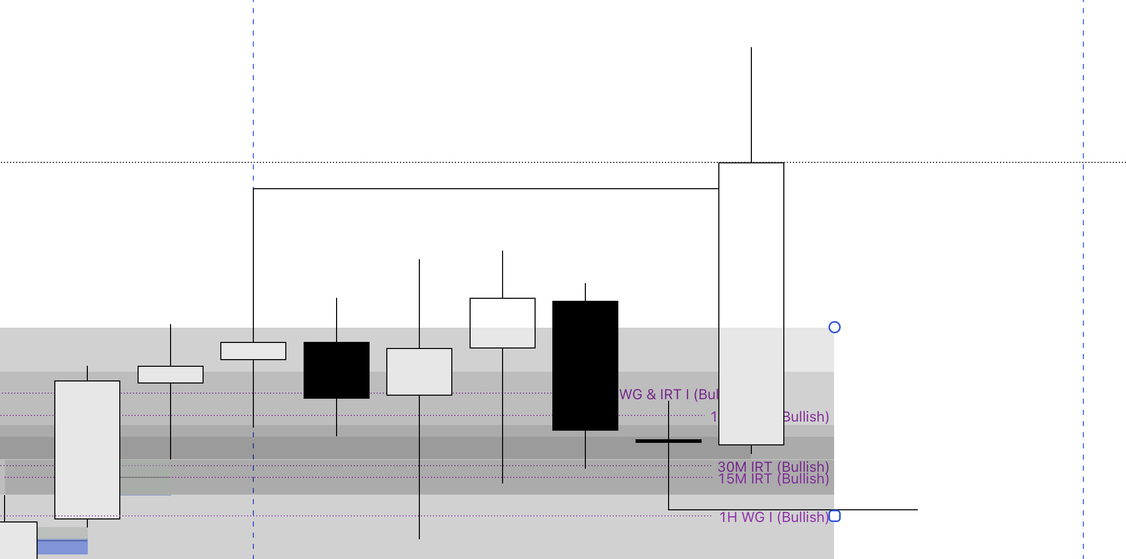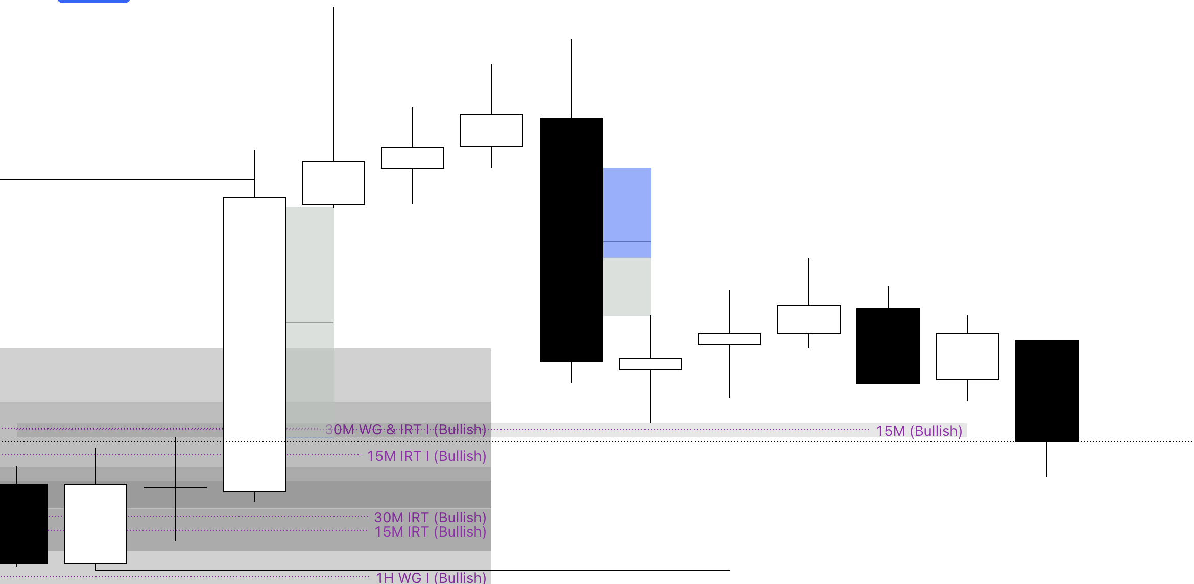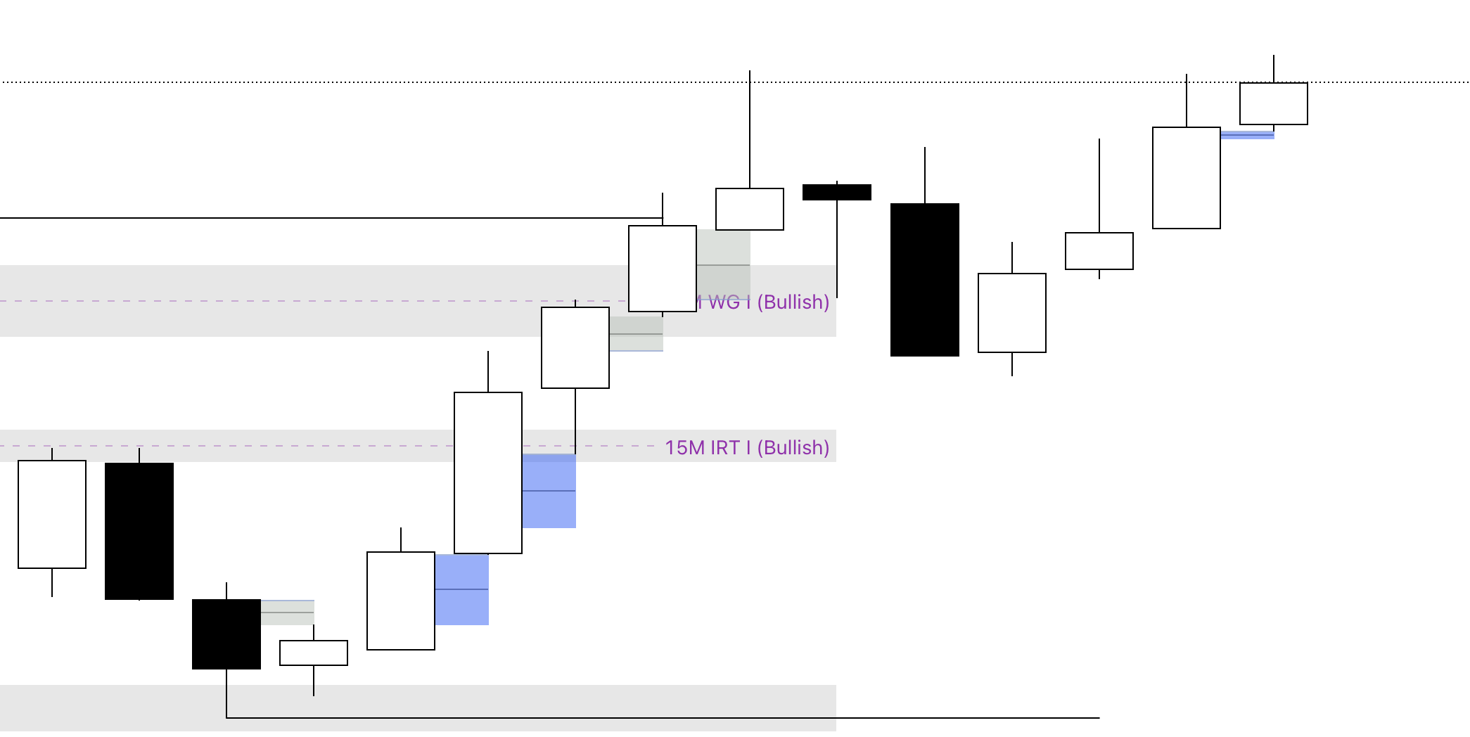 Confluences: A 15M IRT bullish inverse FVG beneath a bullish; 30M WG inverse FVG.