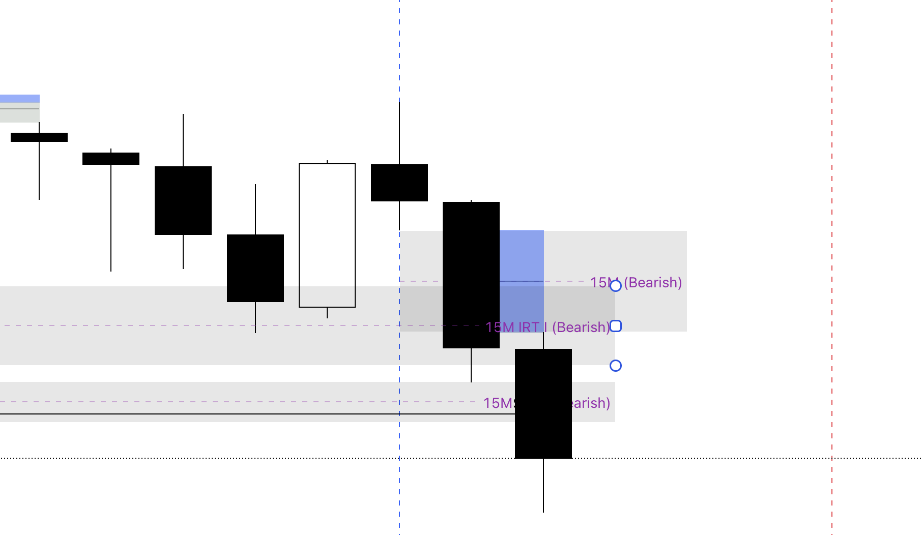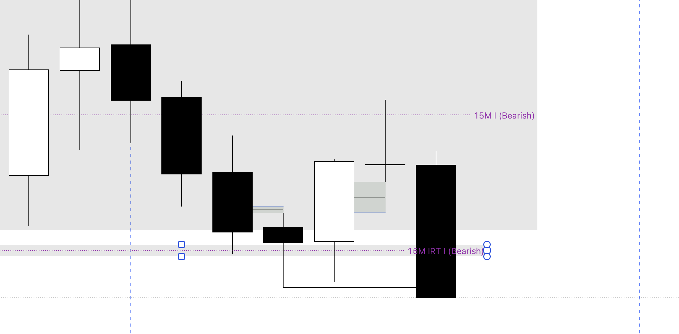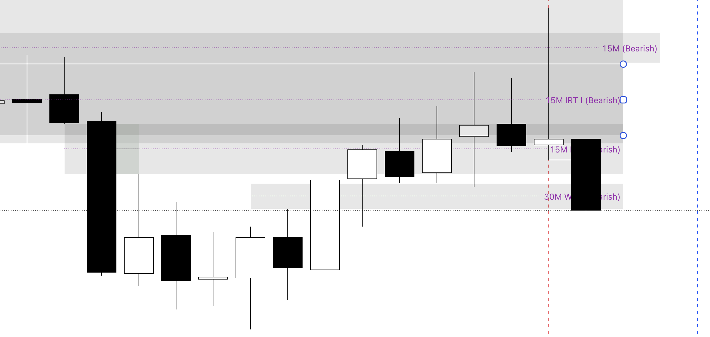 Confluences: A 30M bearish inverse FVG above a bearish; 15M IRT inverse FVG.