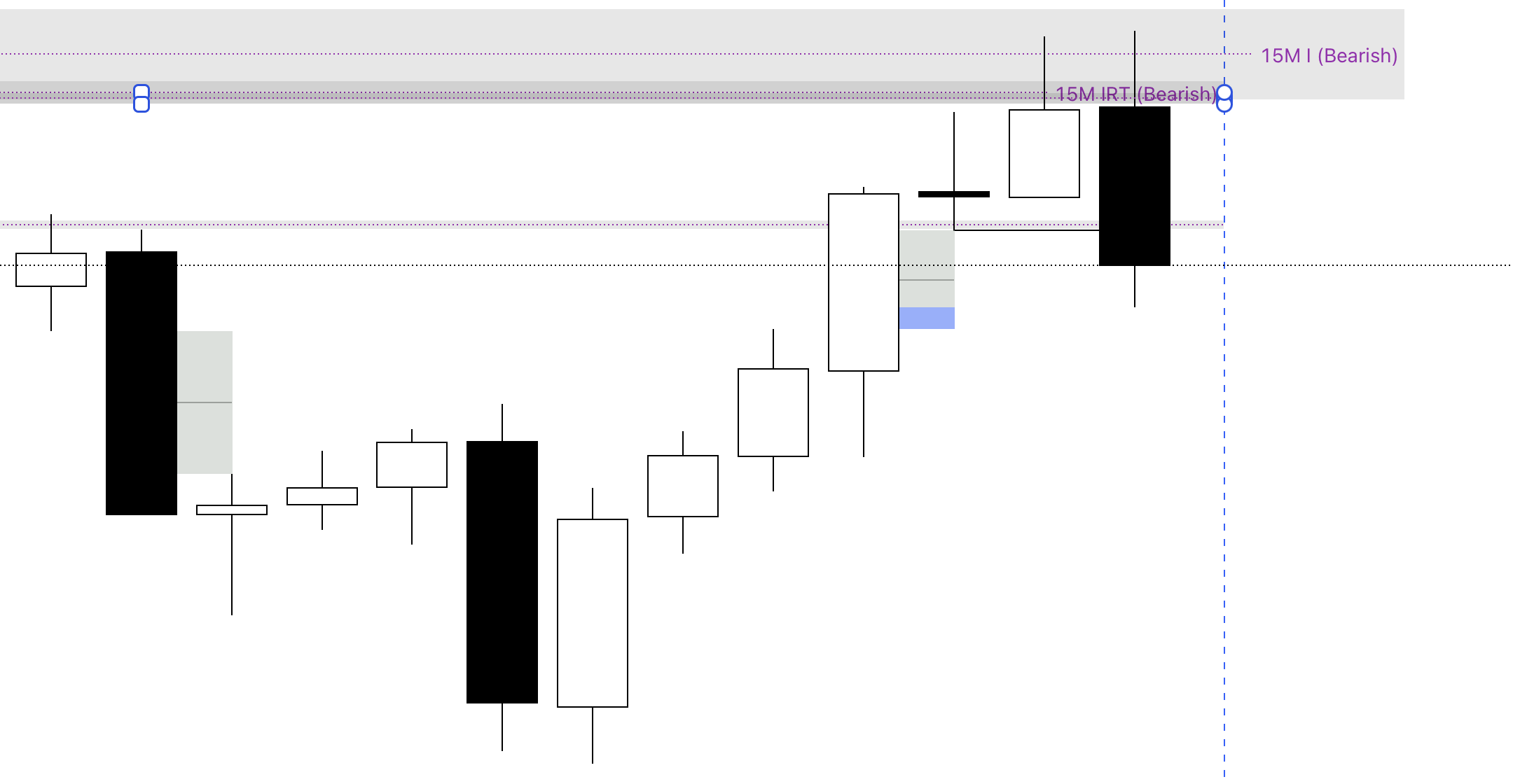 Confluences: 15M swing highs above a 1H IRT bearish FVG.