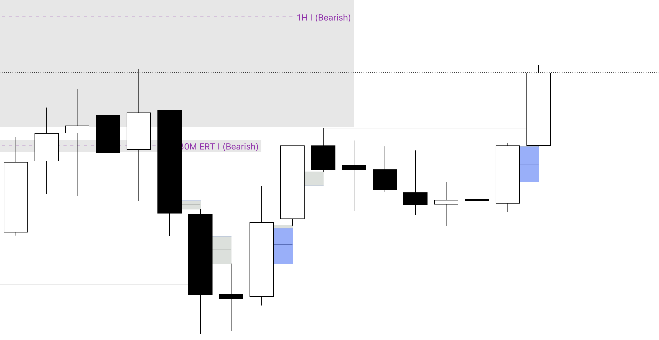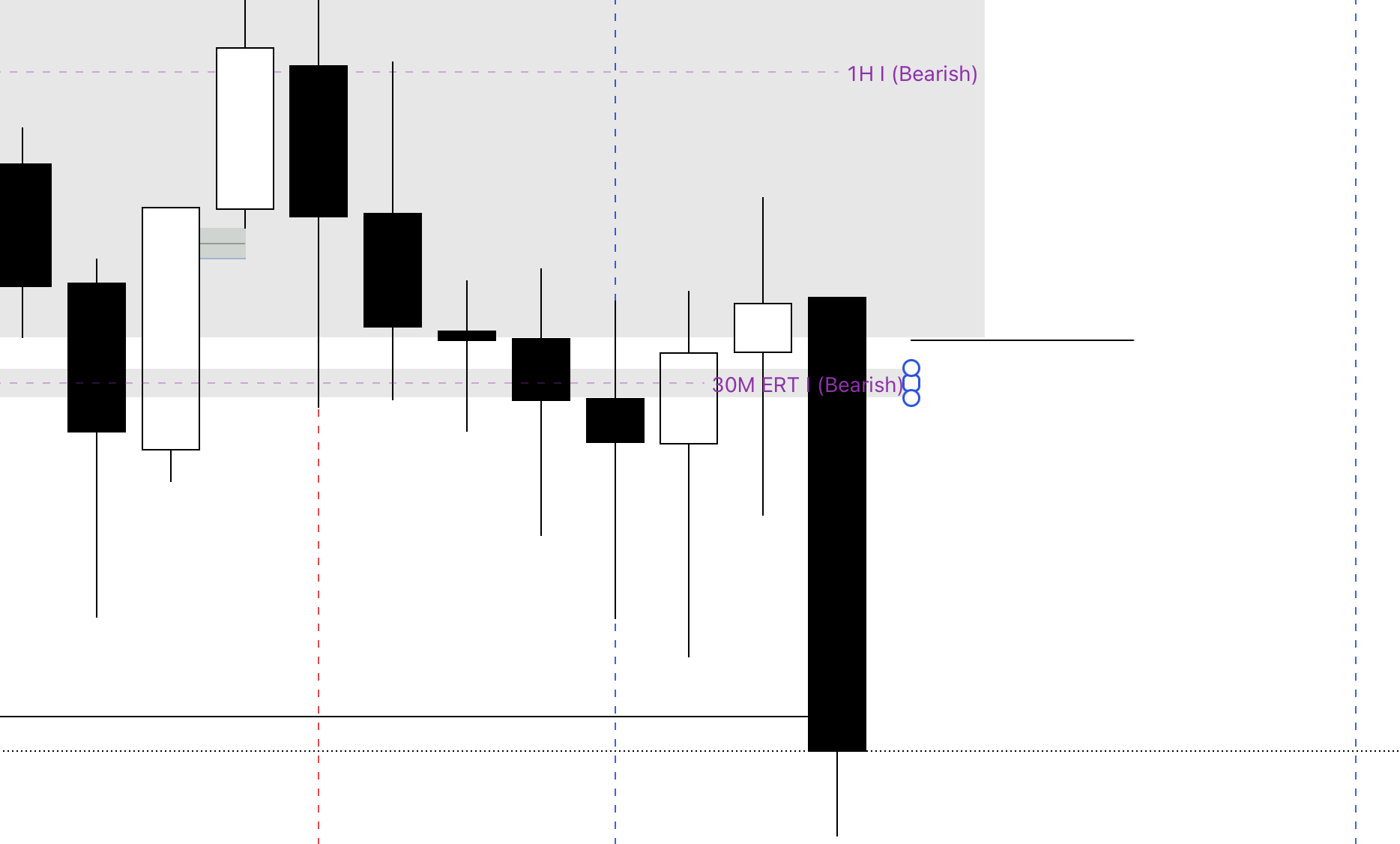 Confluences: A 1H bearish inverse FVG above a bearish; 30M ERT inverse FVG.