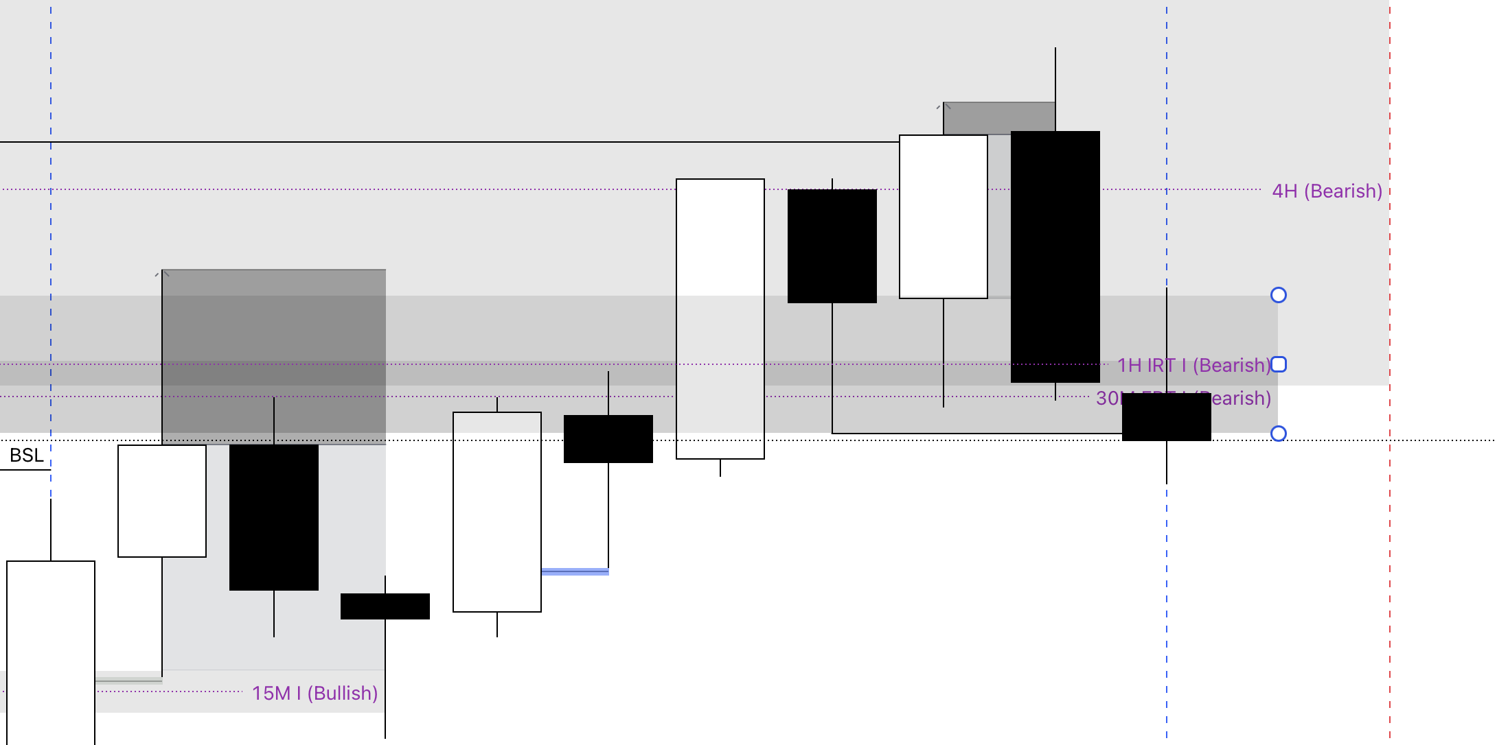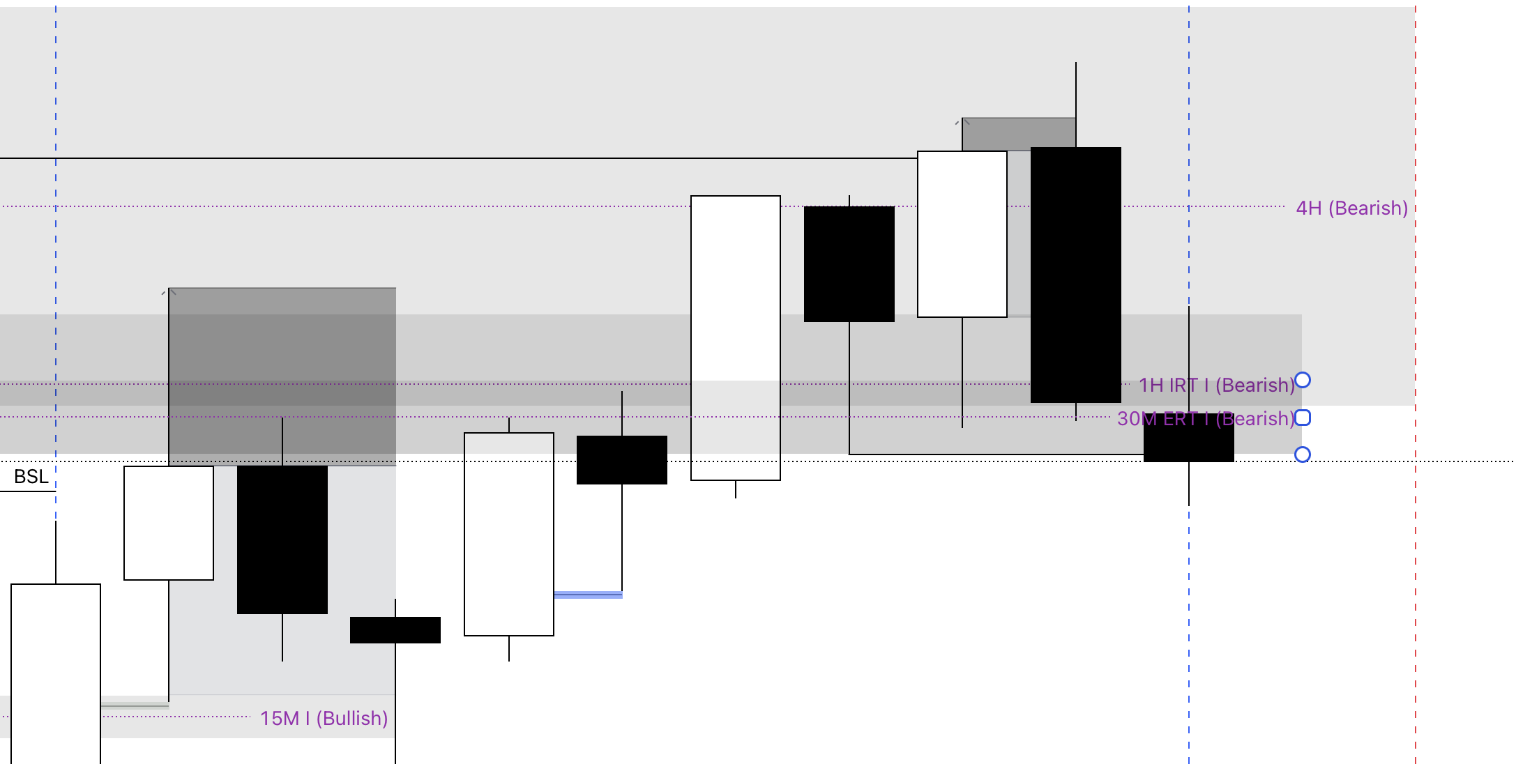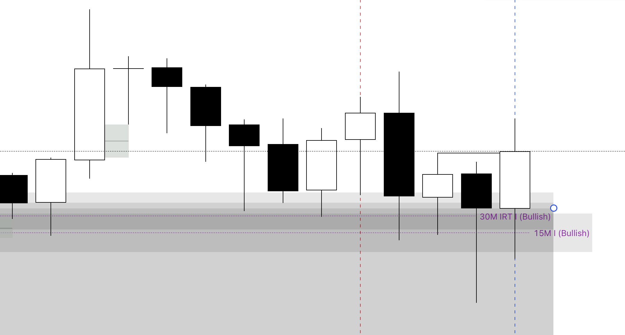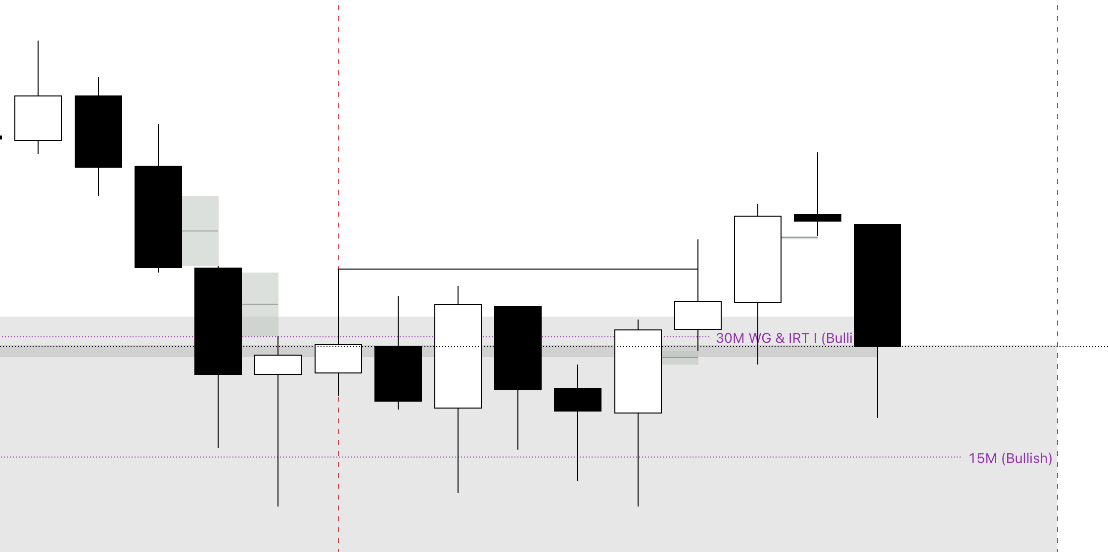 Confluences: A 15M IRT bearish inverse FVG within the bearish 30M IRT inverse FVG.