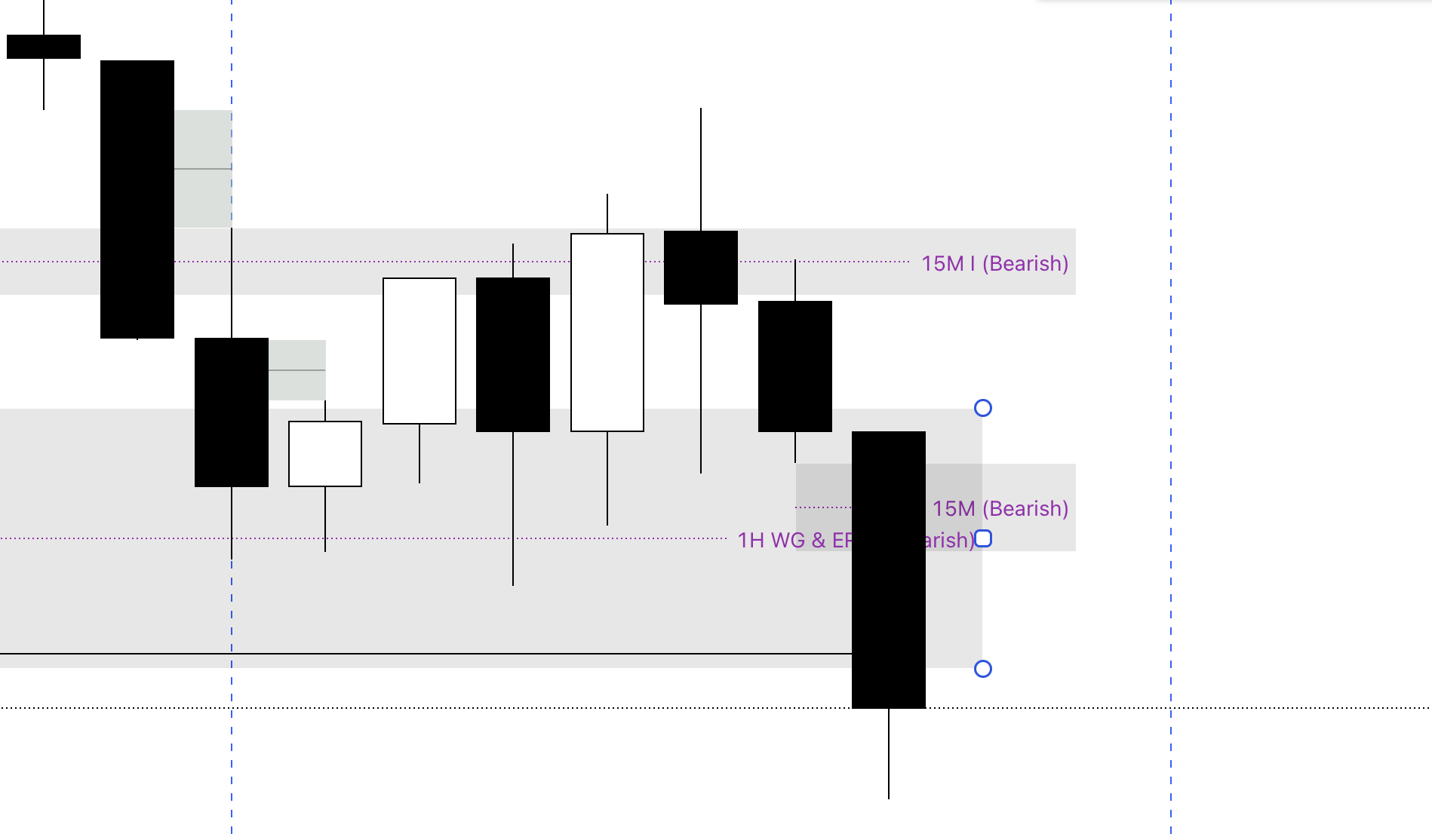 Confluences: A 15M IRT bearish inverse FVG above a bearish; 1H ERT inverse FVG.