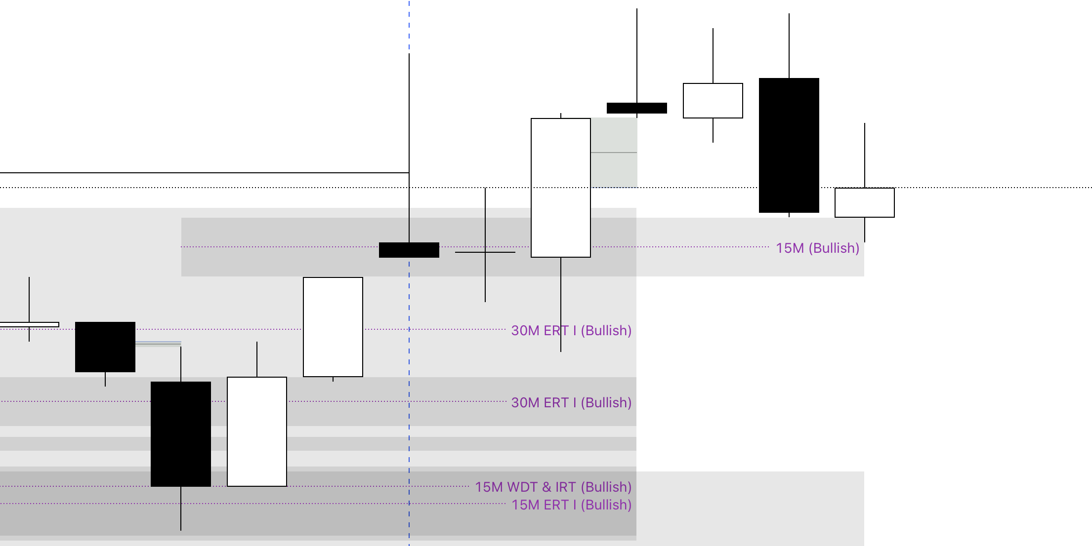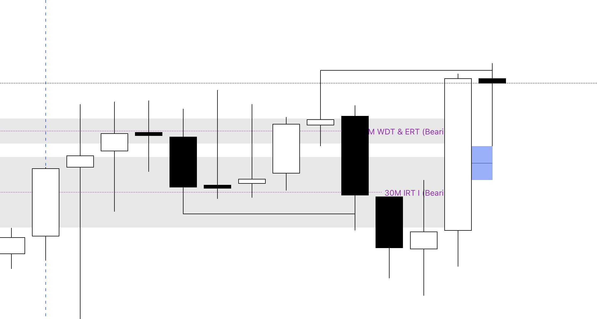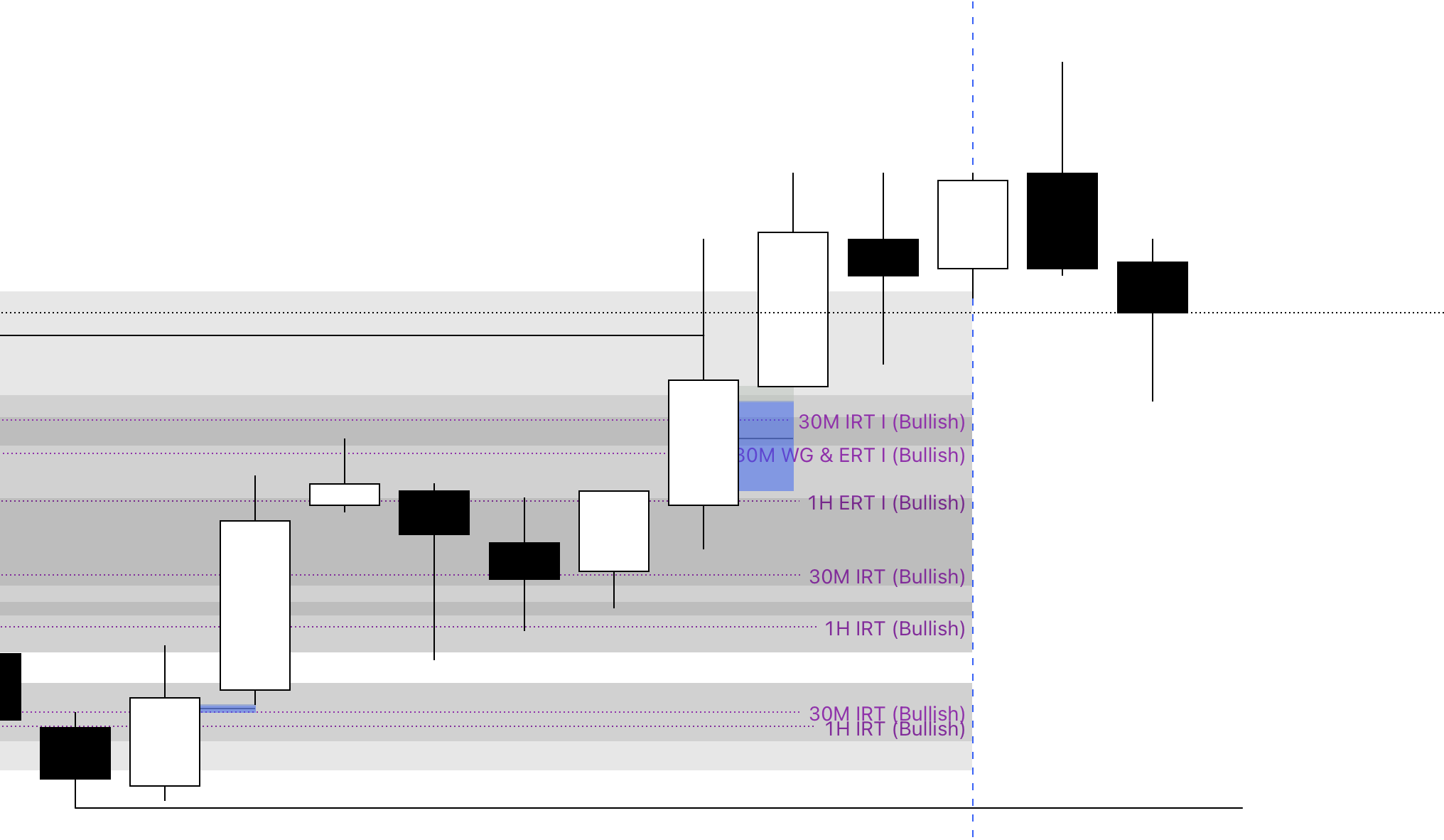 Confluences: A 30M IRT bullish FVG beneath a 30M ERT bullish inverse FVG.