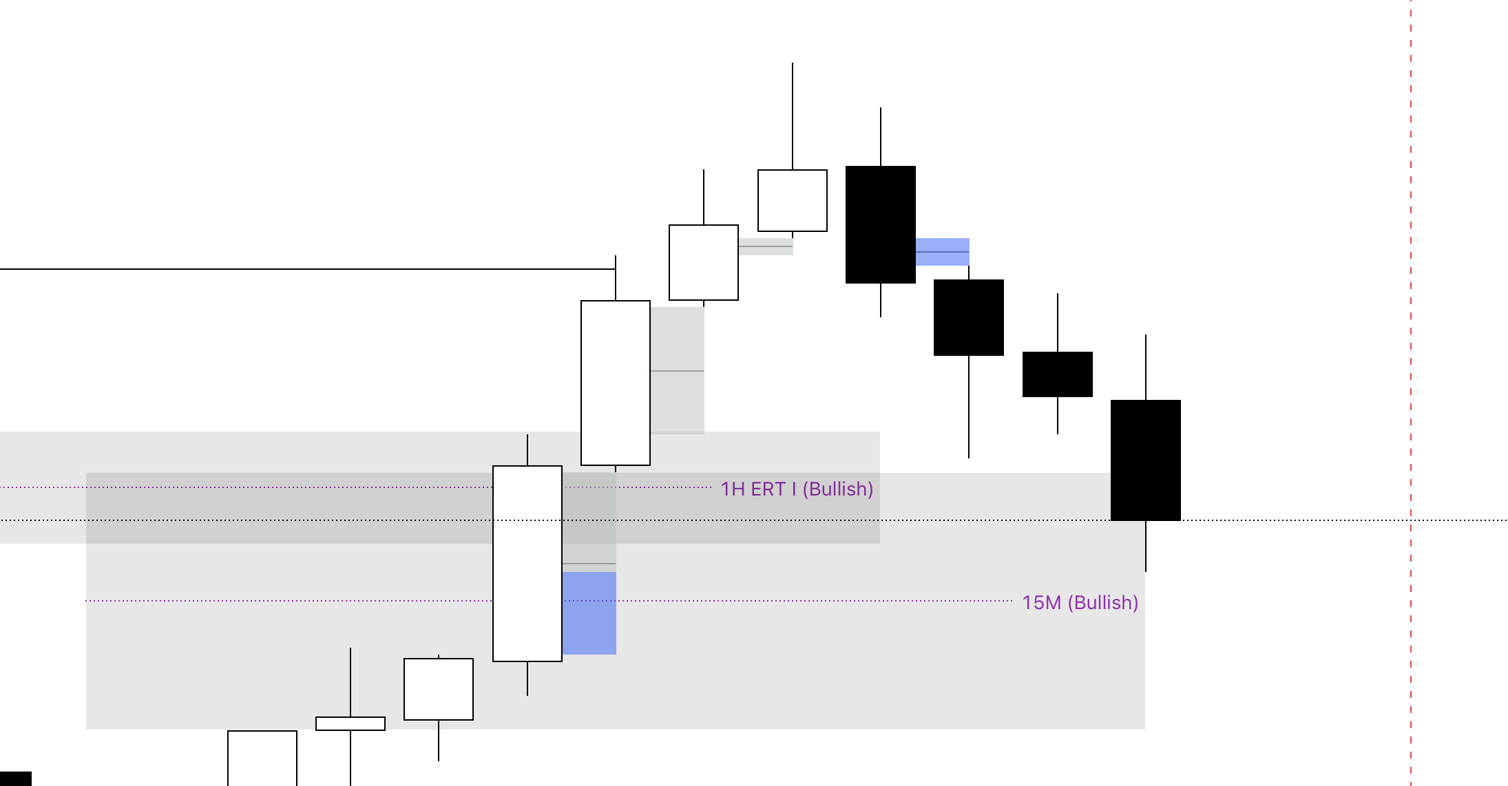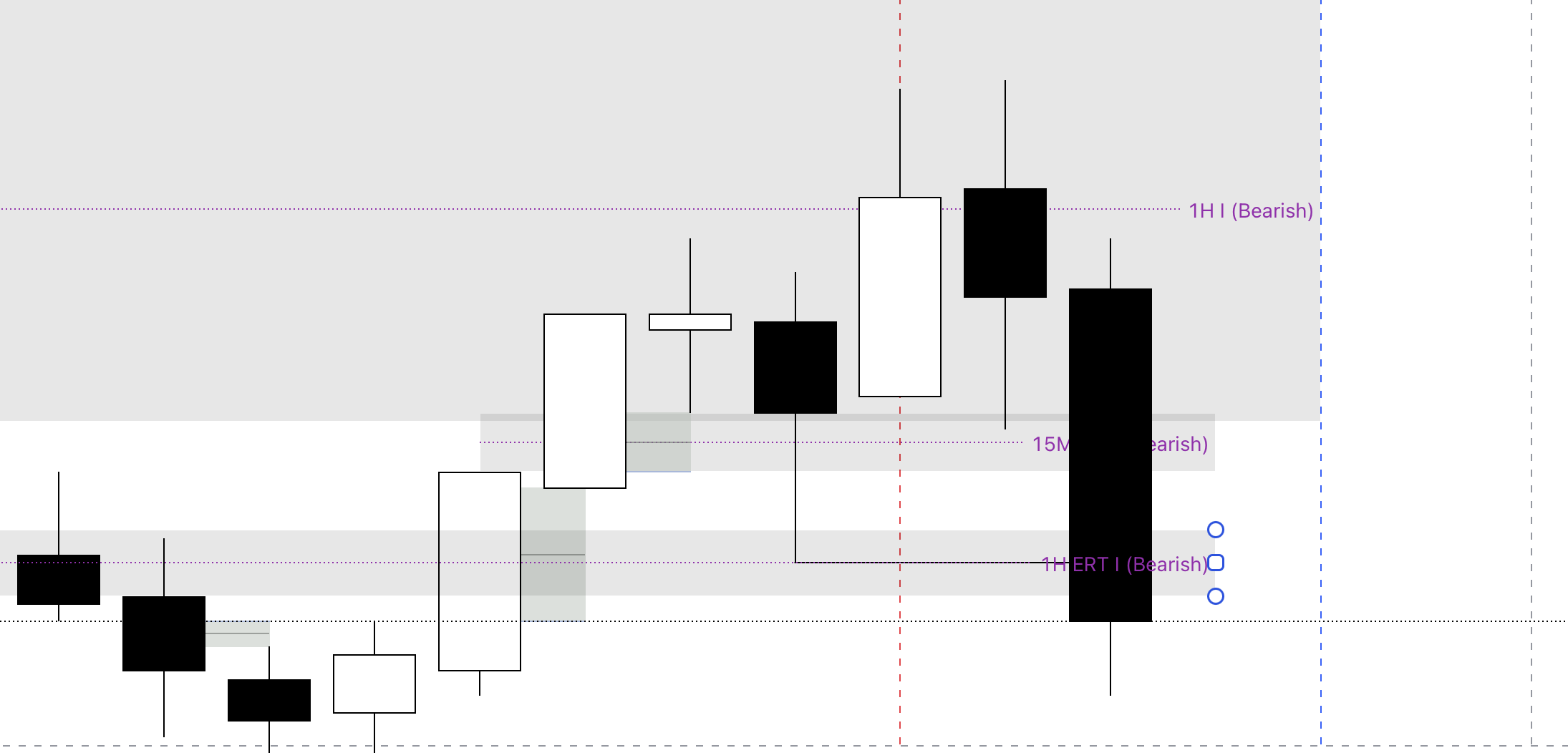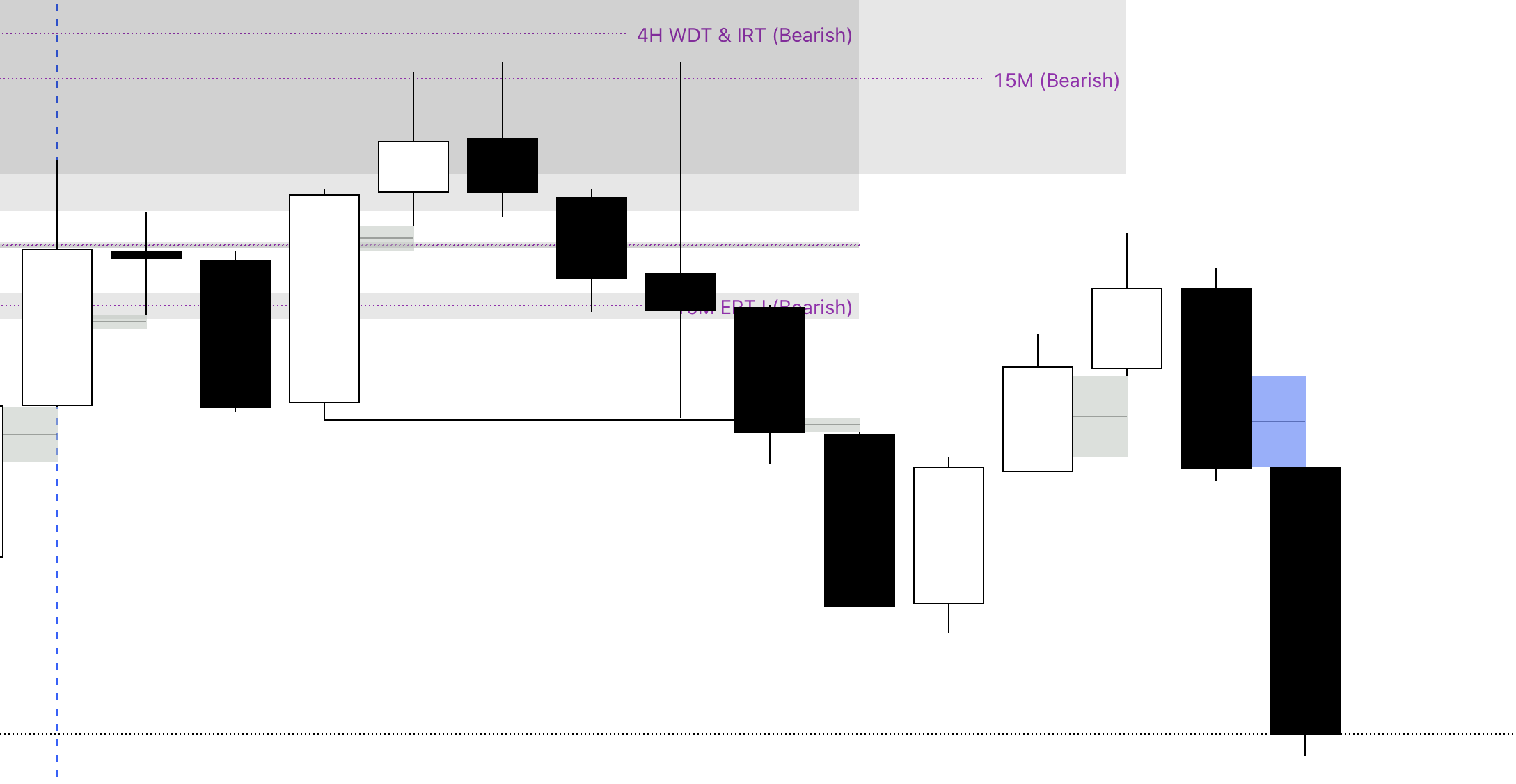 Confluences: A 15M IRT bearish inverse FVG within the bearish 1H ERT inverse FVG.